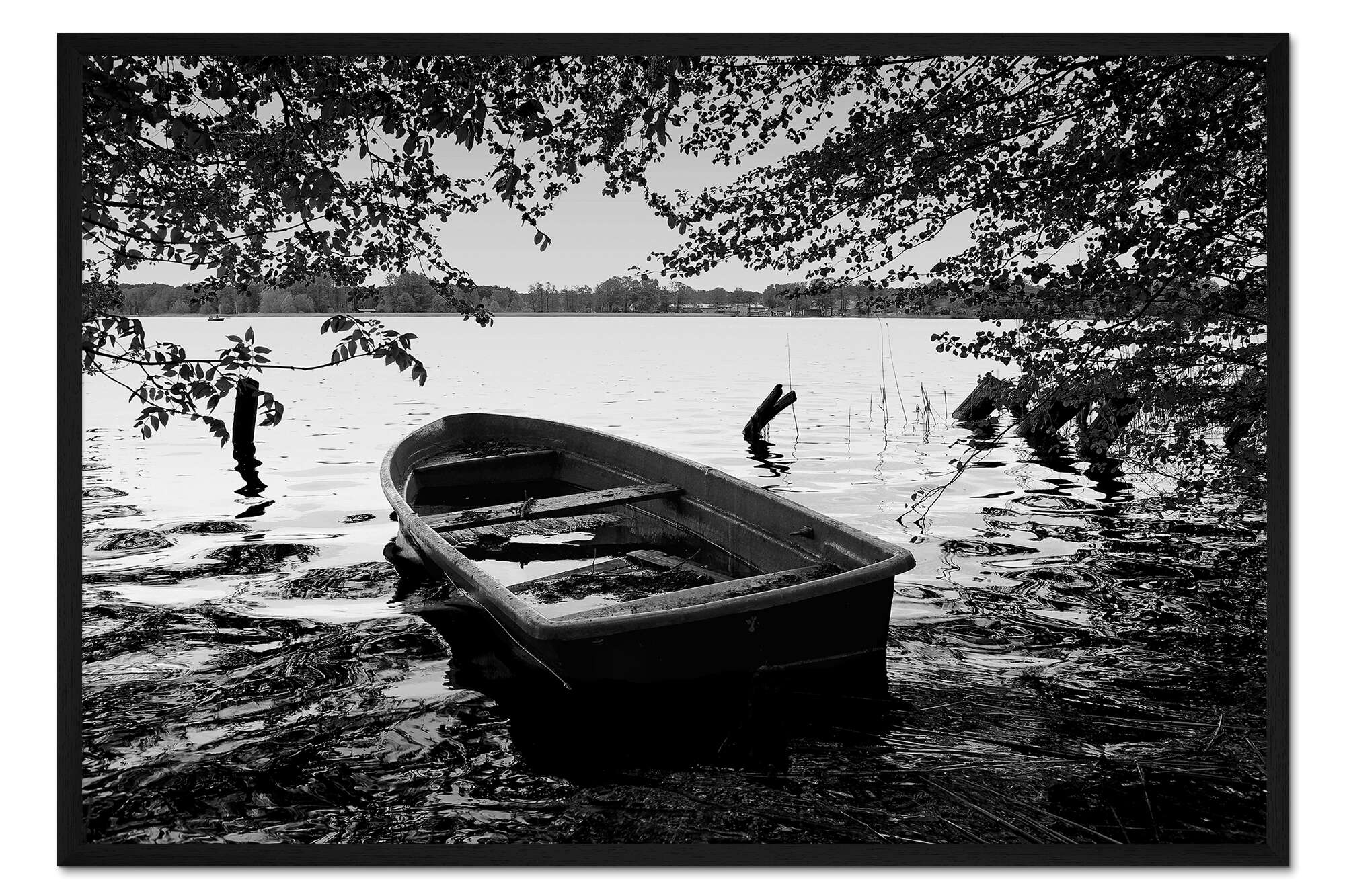 Posterlounge   Wandbilder   Querformat   Frank Herrmann   Gerahmter Kunstdruck Altes Boot unter Bäumen - schwarzweiss