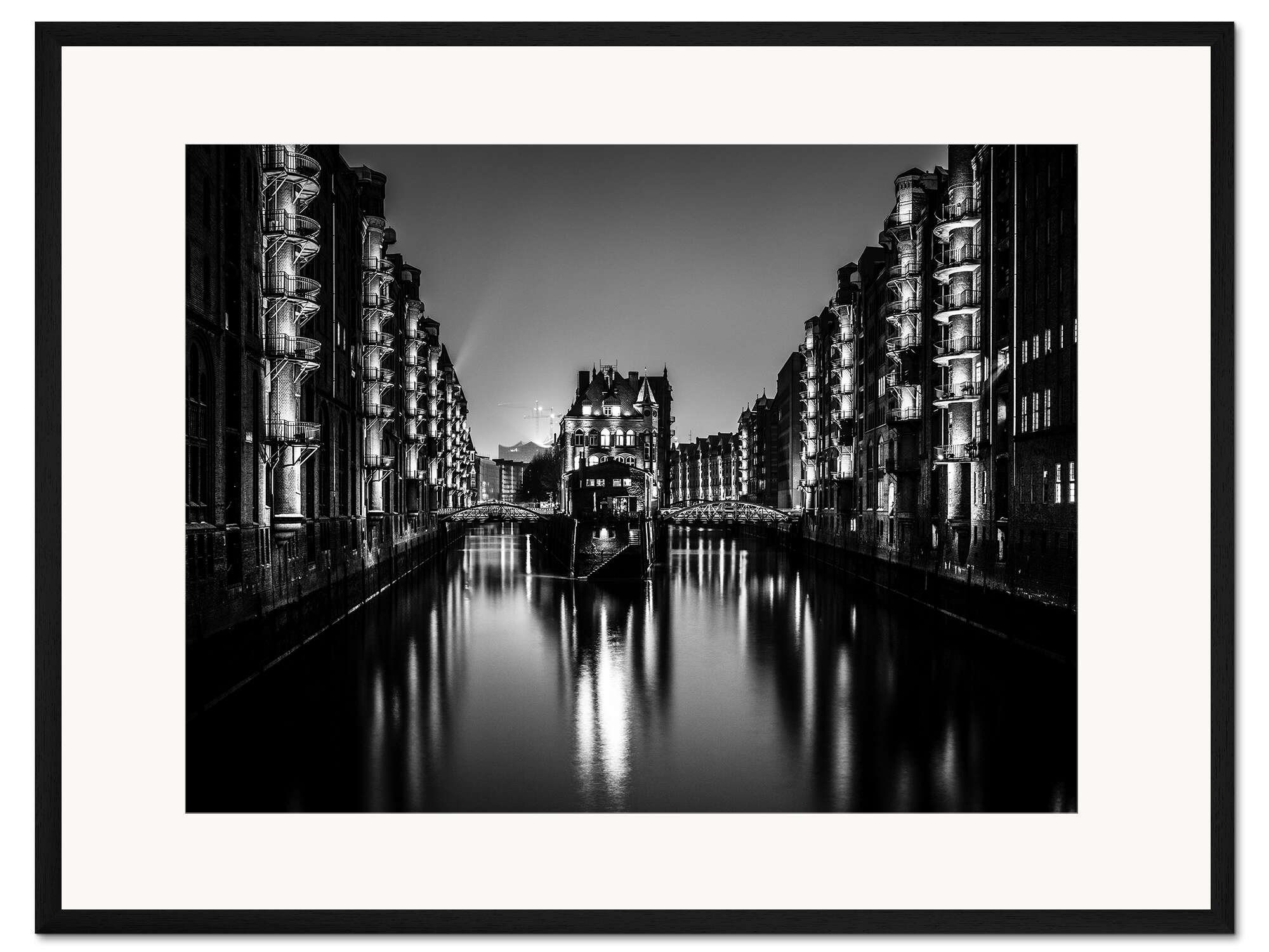 Posterlounge   Wandbilder   Querformat   Sascha Kilmer   Gerahmter Kunstdruck Hamburg Speicherstadt bei Nacht (schwarz weiß)
