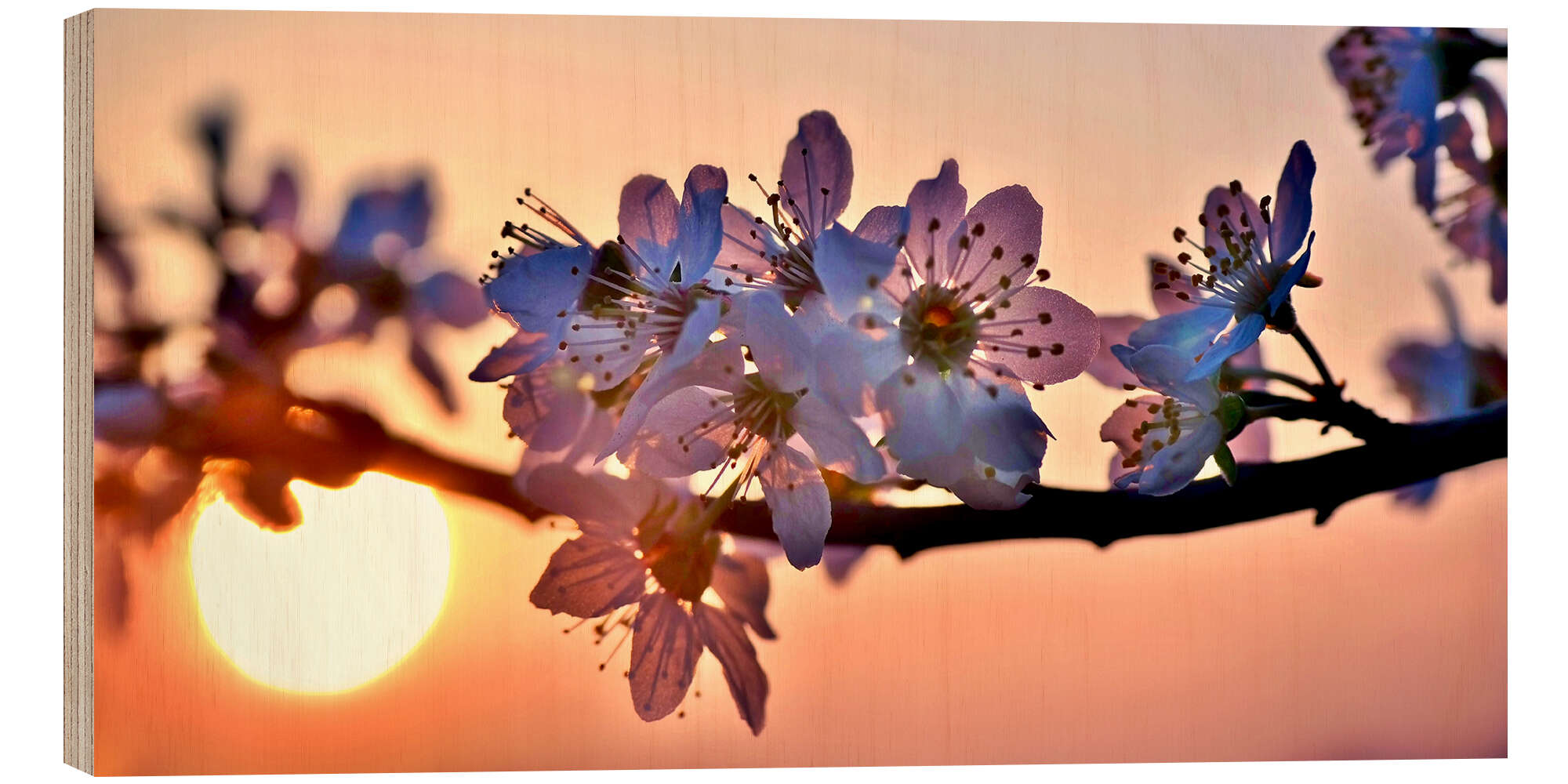Posterlounge   Wandbilder   Panorama   Julia Delgado   Holzbild Kirschblüten vor untergehender Abendsonne