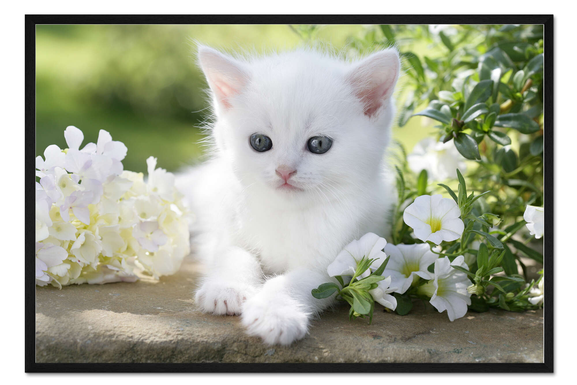 Posterlounge   Wandbilder   Querformat   Greg Cuddiford   Gerahmter Kunstdruck Weiße Blumen mit weißem Kätzchen