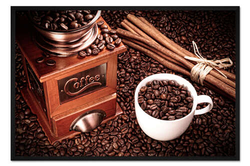 Posterlounge   Wandbilder   Querformat   pixelliebe   Gerahmter Kunstdruck Kaffee Bohnen mit Mühle, Zimt und Tasse