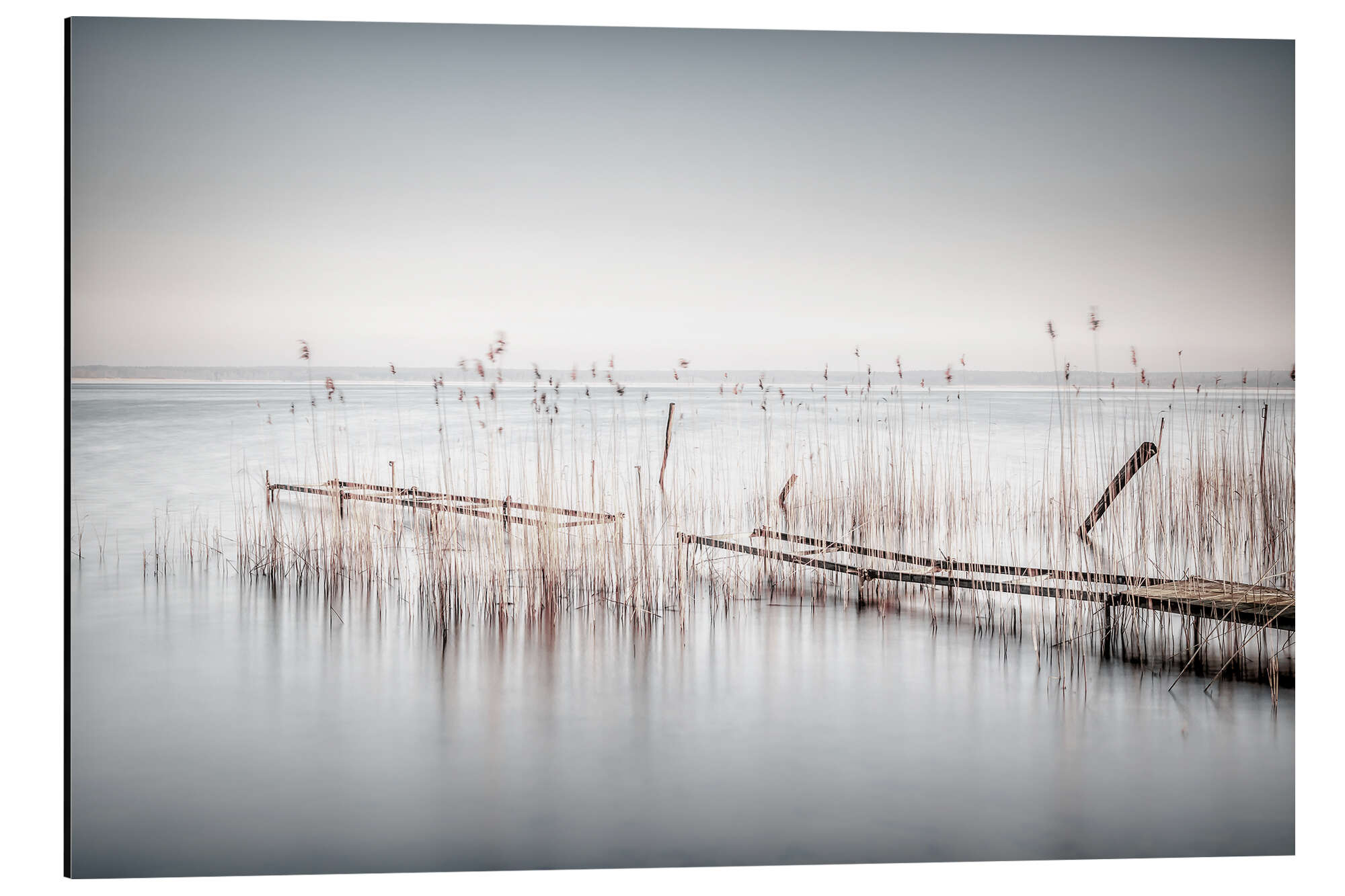 Eisbedecktes Ufer mit Schilf bei Sonnenuntergang