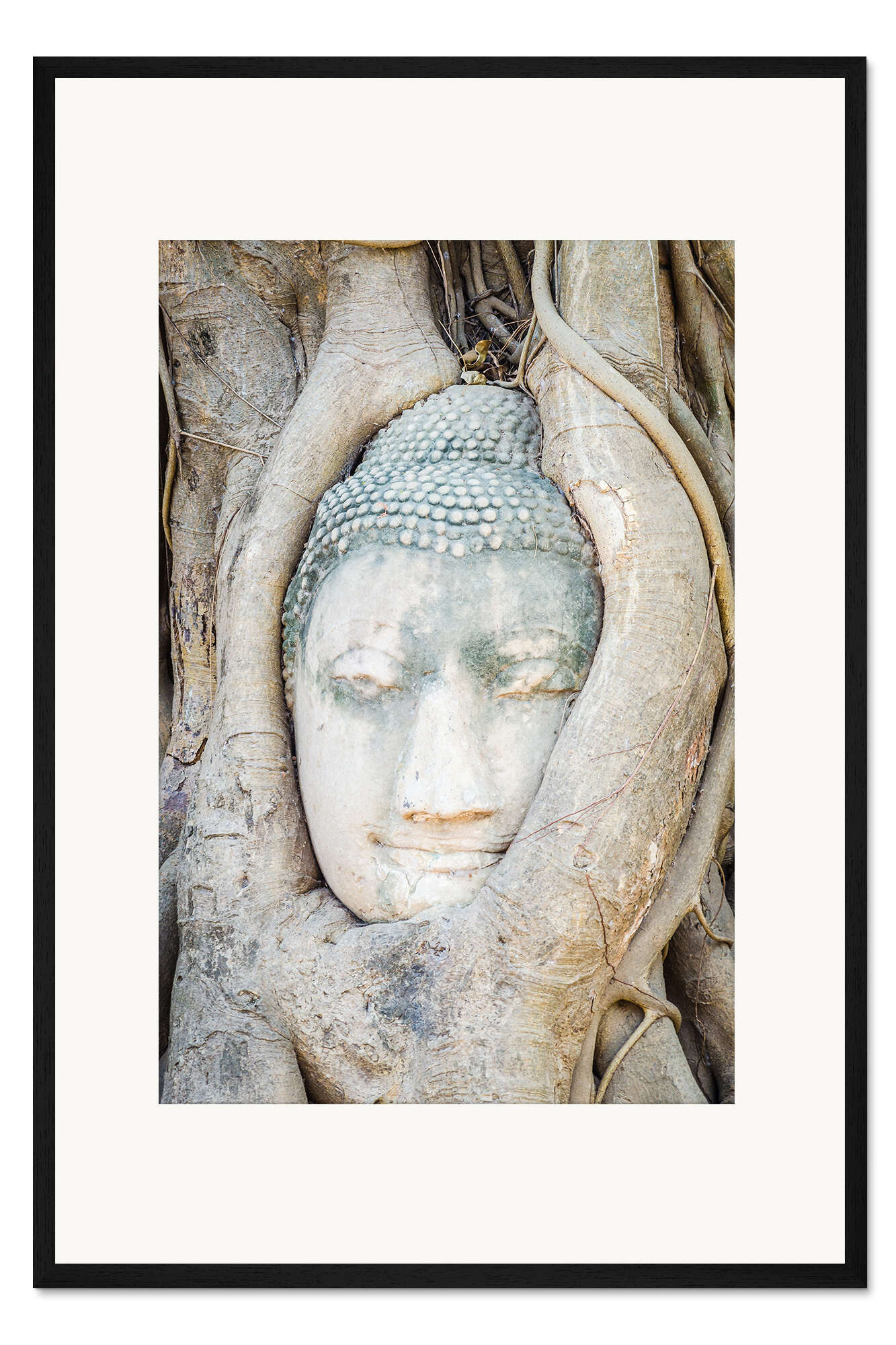 Posterlounge   Wandbilder   Fotografie   Gerahmter Kunstdruck Buddha-Kopf hinter Baumstamm in Ayutthaya, Thailand