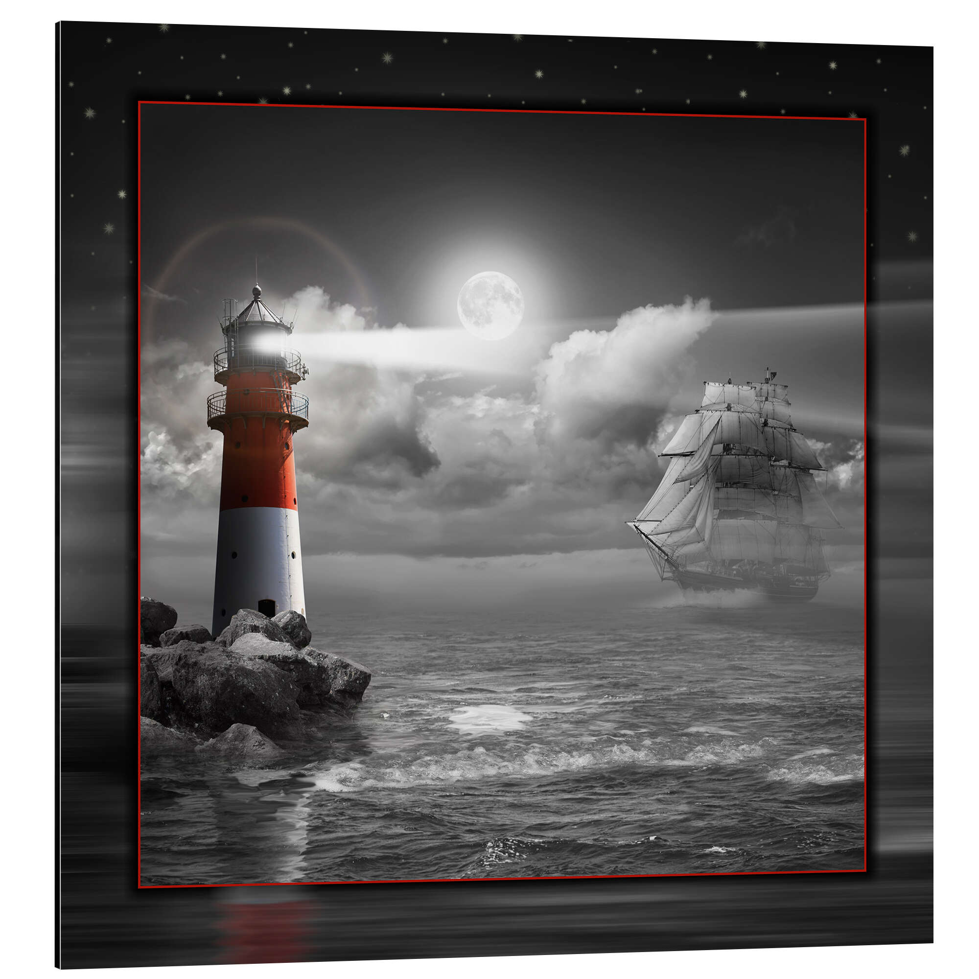 Posterlounge   Wandbilder   Illustration   Monika Jüngling   Magnettafel Leuchtturm und Segelschiff im Mondschein