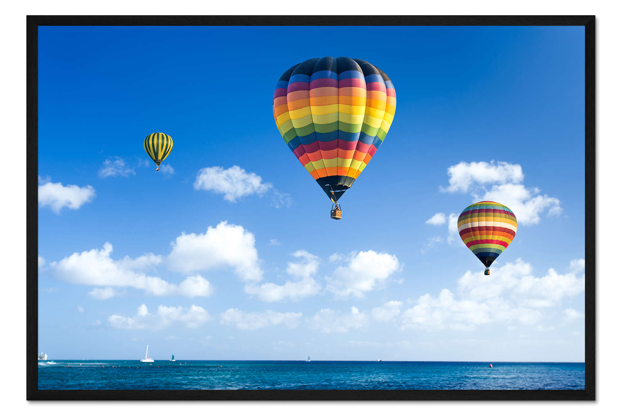 Posterlounge   Wandbilder   Querformat   Gerahmter Kunstdruck Bunte Heißluftballone über dem blauen Meer