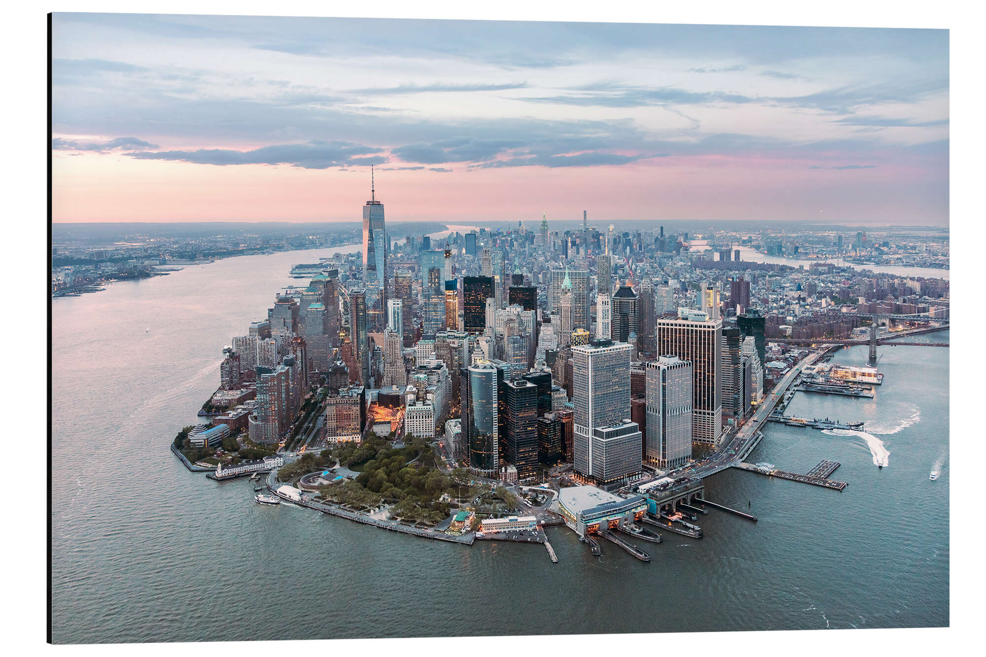 Magnettafel Luftaufnahme von Lower Manhattan mit One World Trade Center bei Sonnenuntergang, New York City, USA