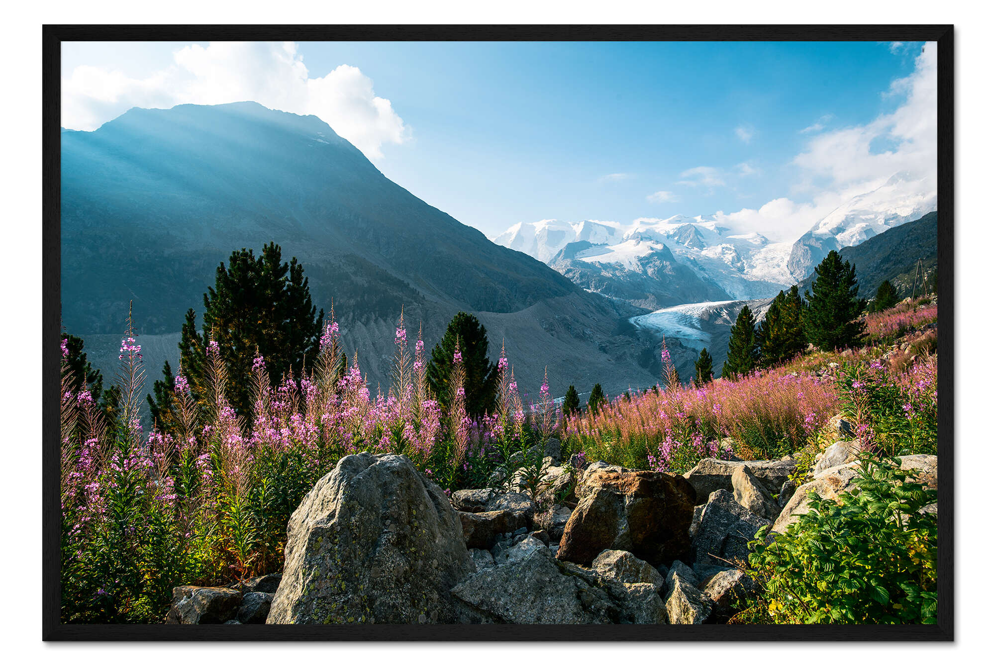 Posterlounge   Wandbilder   Fotografie   Peter Wey   Gerahmter Kunstdruck Panoramablick auf Morteratsch Tal mit Piz Palu Berggipfel im Hintergrund Pontresina, Endg
