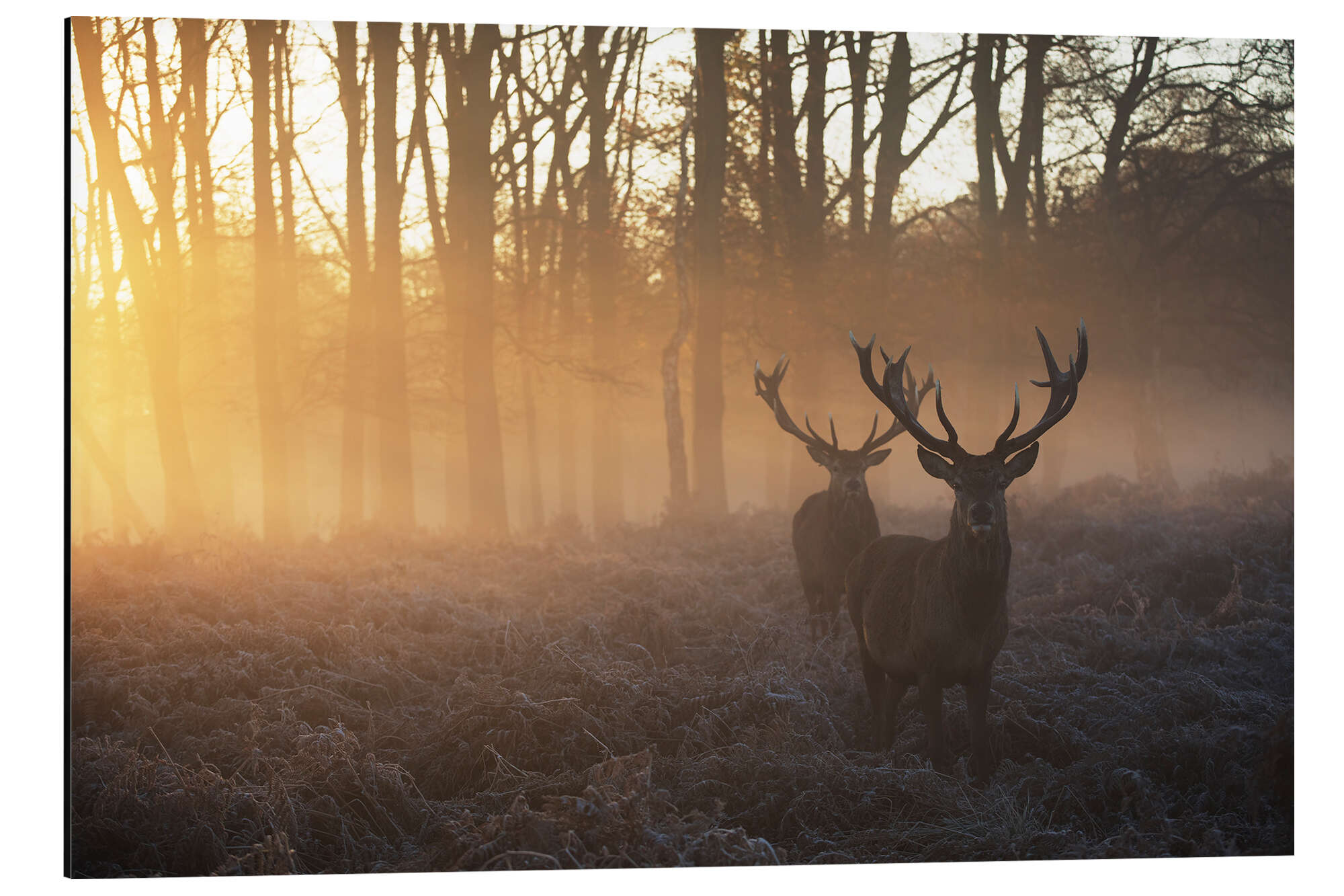 Posterlounge   Wandbilder   Querformat   Alex Saberi   Magnettafel Zwei Hirsche in einem nebligen Wald in Richmond Park, London