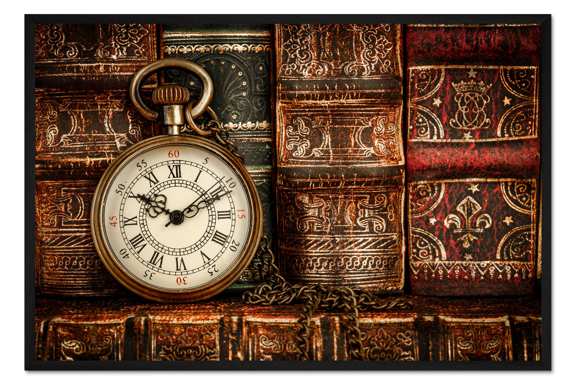 Posterlounge   Wandbilder   Sepia   Gerahmter Kunstdruck Uhr vor Büchern