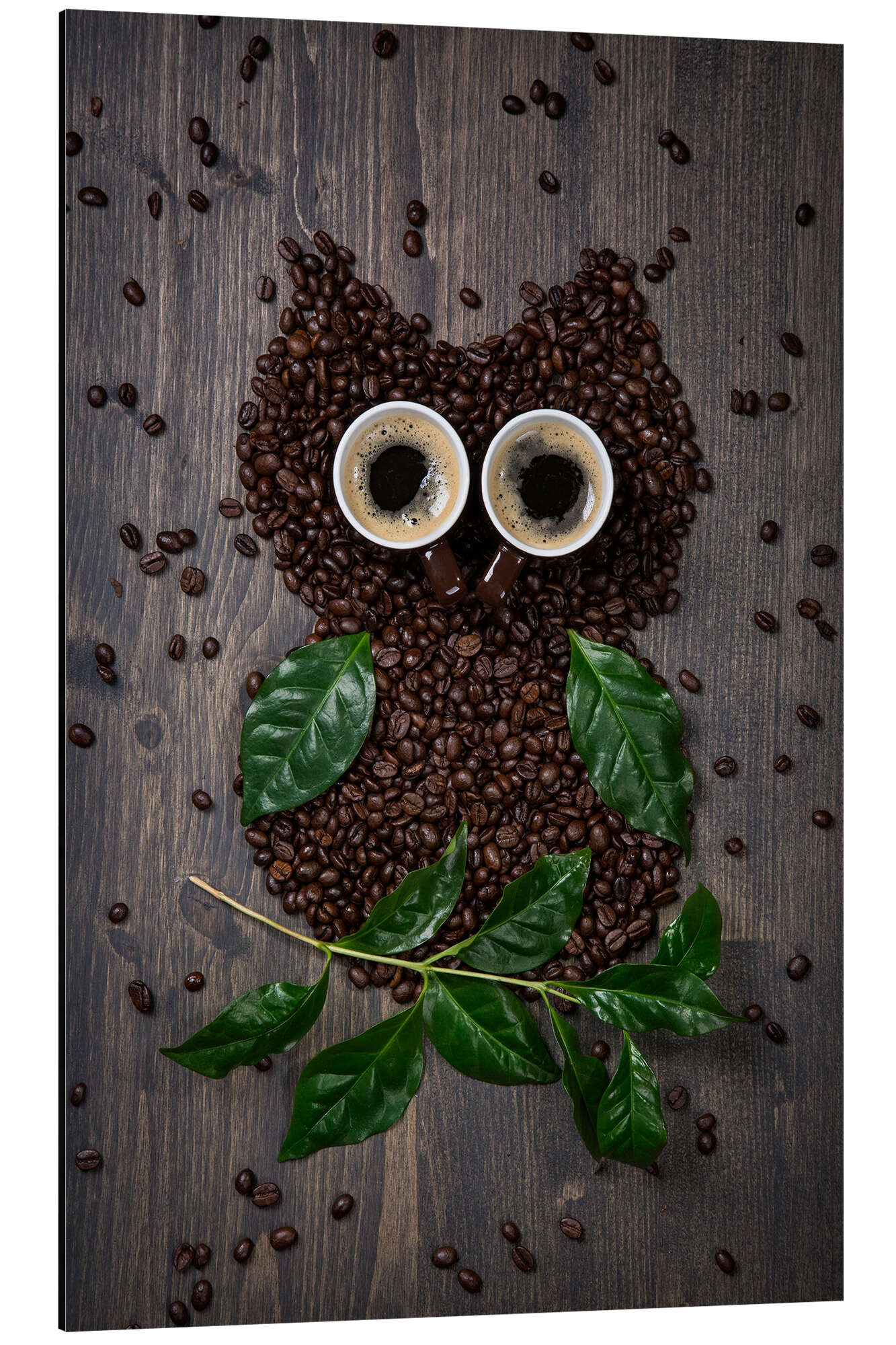 Posterlounge   Wandbilder   Fotografie   Elena Schweitzer   Magnettafel Kaffee-Eule aus Bohnen, Blättern und Tassen