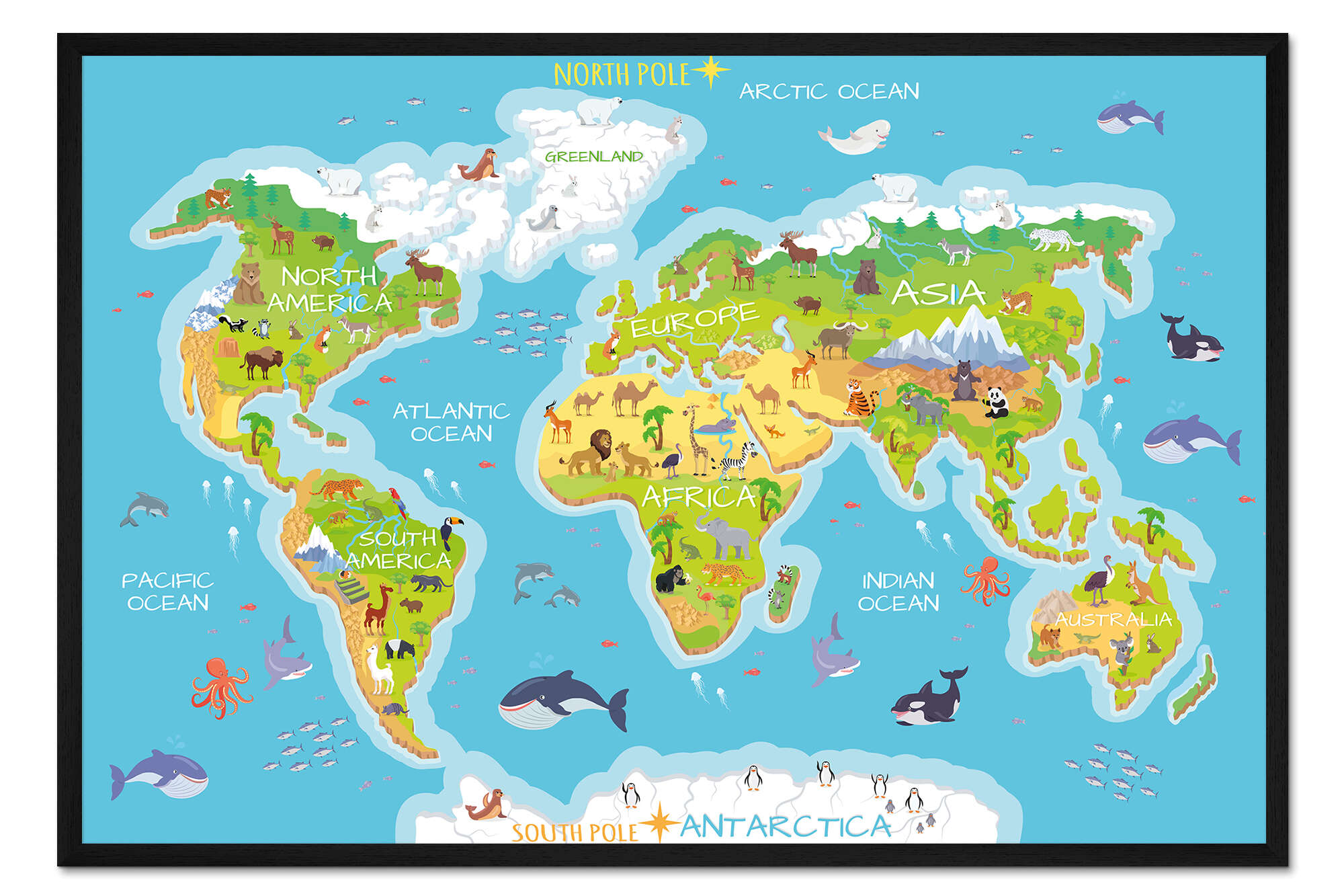 Posterlounge   Wandbilder   Kindergarten   Kidz Collection   Gerahmter Kunstdruck Weltkarte mit Tieren - Englisch