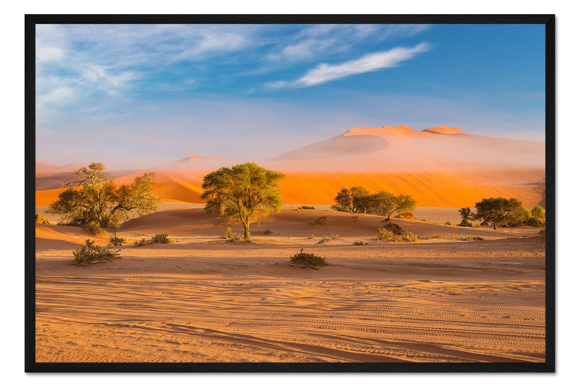 Posterlounge   Wandbilder   Fotografie   Fabio Lamanna   Gerahmter Kunstdruck Morgennebel über Sanddünen und Akazienbäume bei Sossusvlei, Namibia