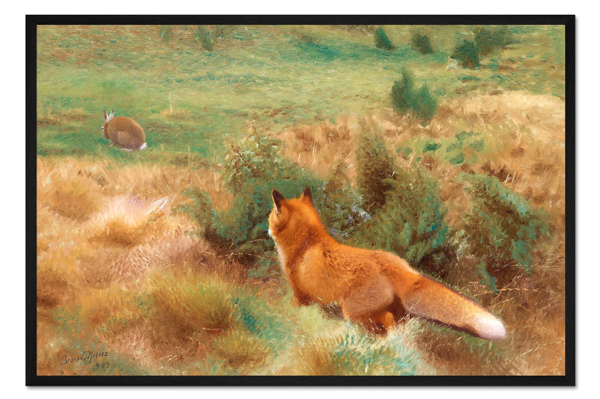 Posterlounge   Wandbilder   Grün   Bruno Andreas Liljefors   Gerahmter Kunstdruck Fuchs beobachtet einen Hasen