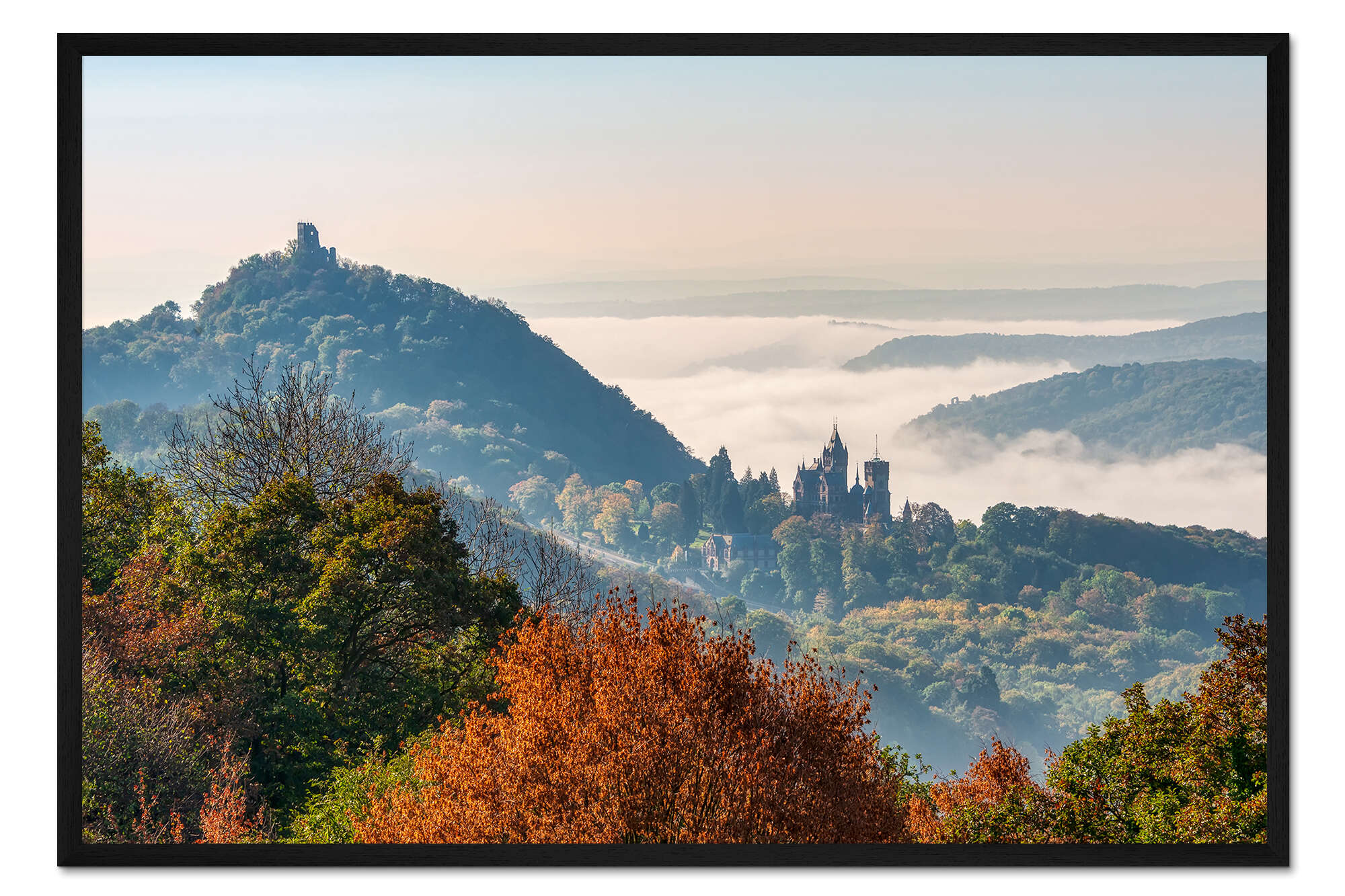 Posterlounge   Wandbilder   Landschaften   Berge & Gebirge   Katho Menden   Gerahmter Kunstdruck Drachenfels mit Nebel im Rheintal