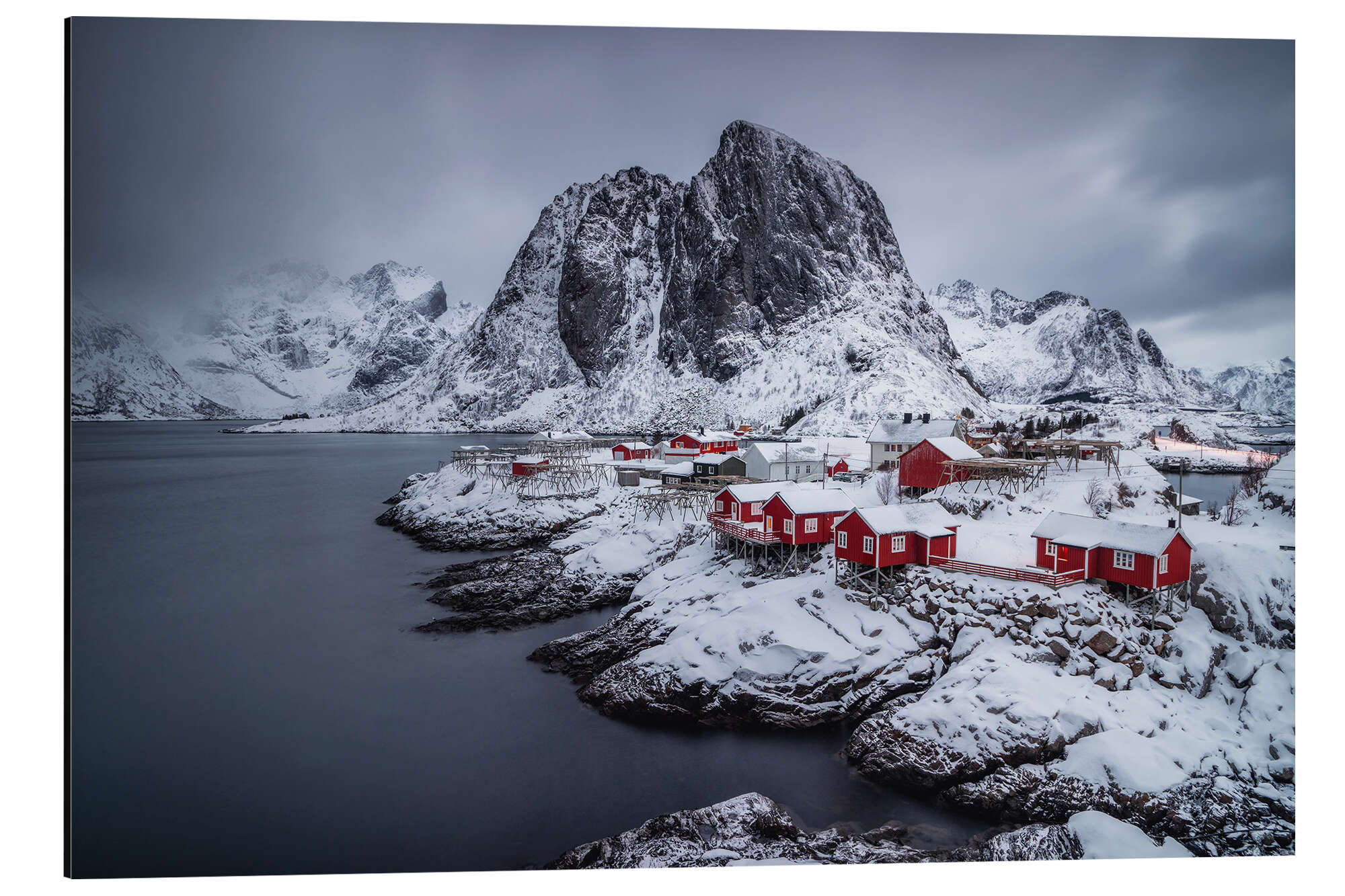 Posterlounge   Wandbilder   Reisen   Norwegen   Dennis Fischer   Magnettafel Rote Häuser auf den verschneiten Lofoten