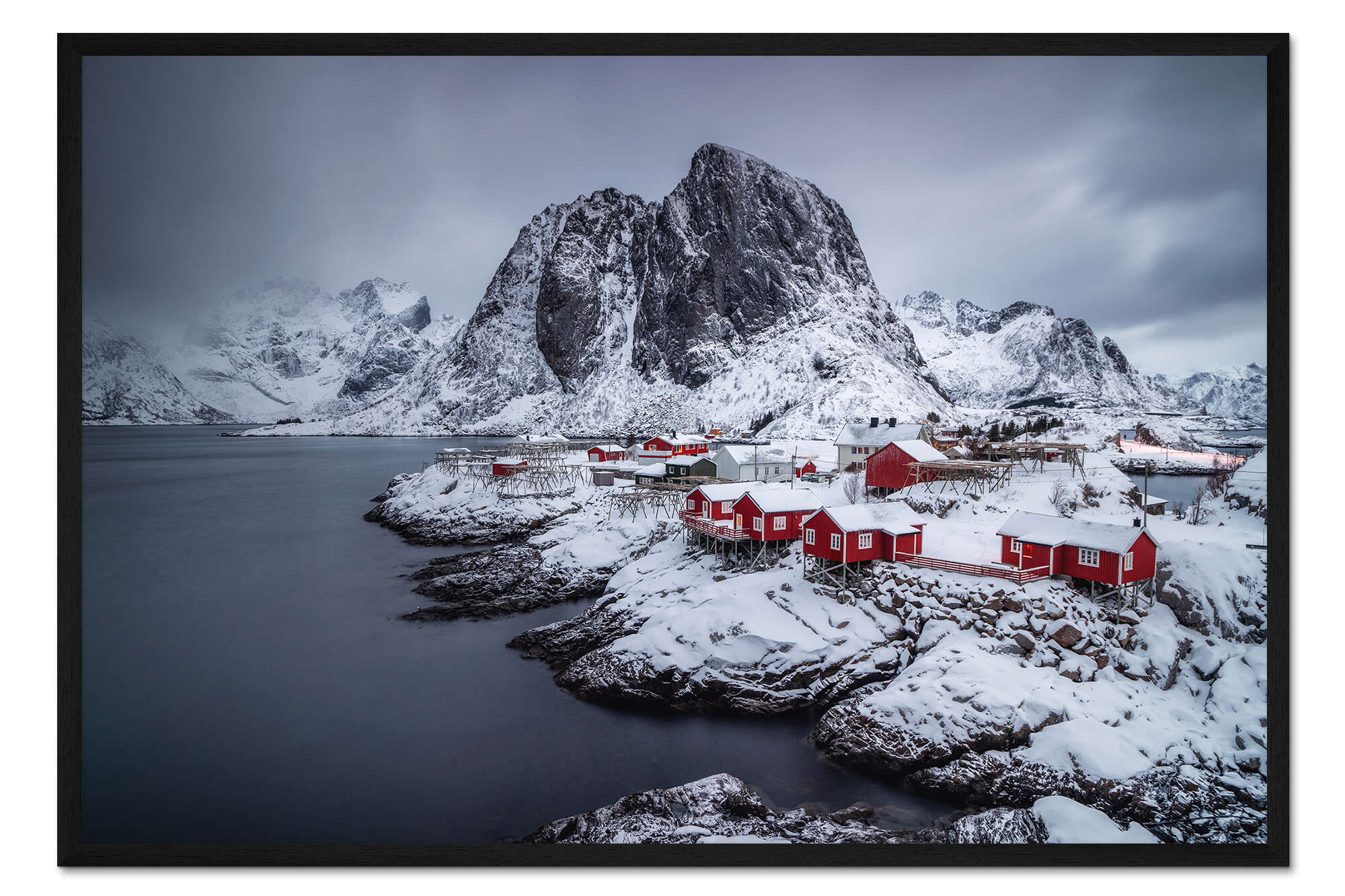 Posterlounge   Wandbilder   Reisen   Norwegen   Dennis Fischer   Gerahmter Kunstdruck Rote Häuser auf den verschneiten Lofoten