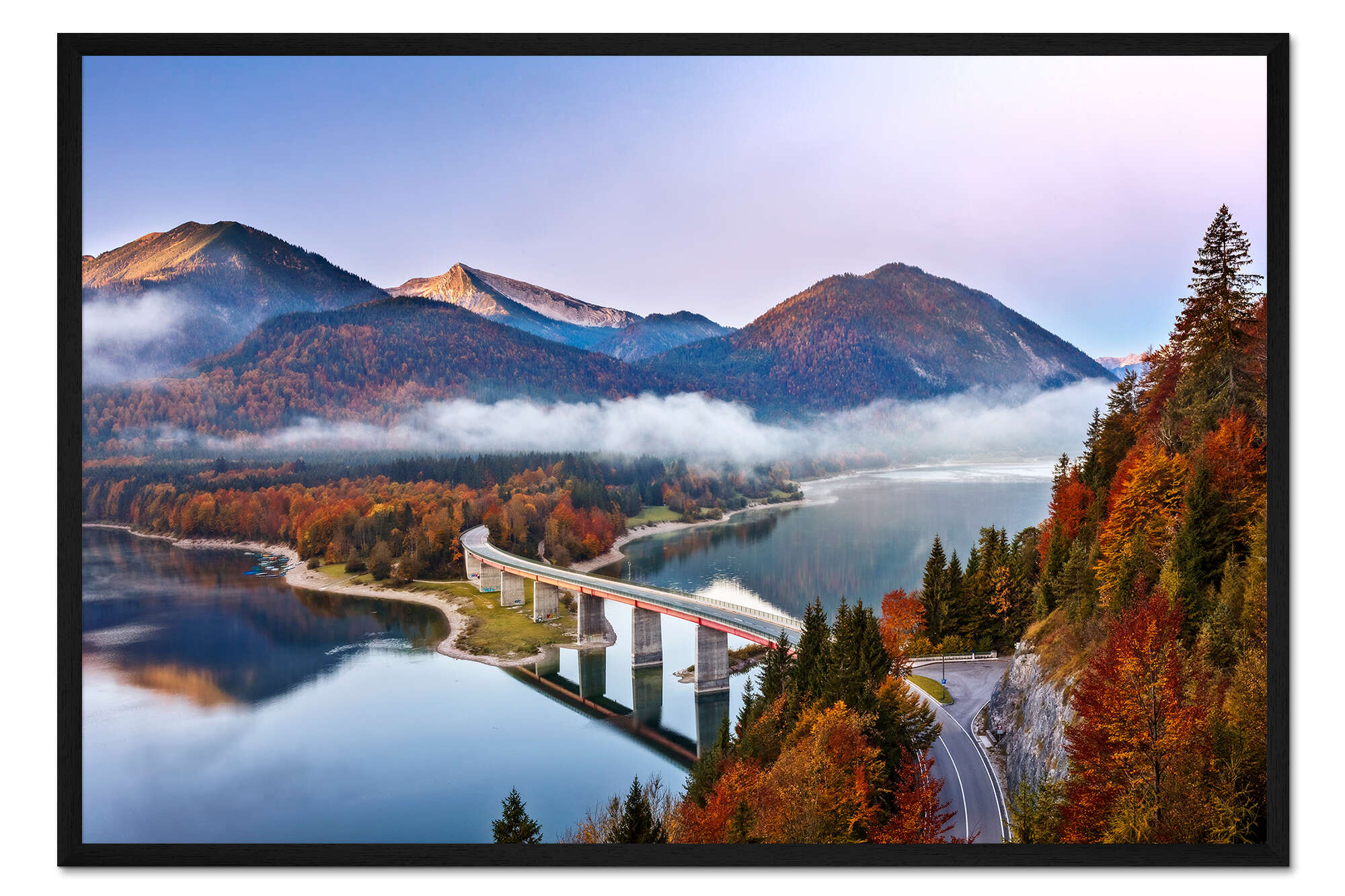 Posterlounge   Wandbilder   Fotografie   Dieter Meyrl   Gerahmter Kunstdruck Brücke über Sylvensteinsee im Herbst