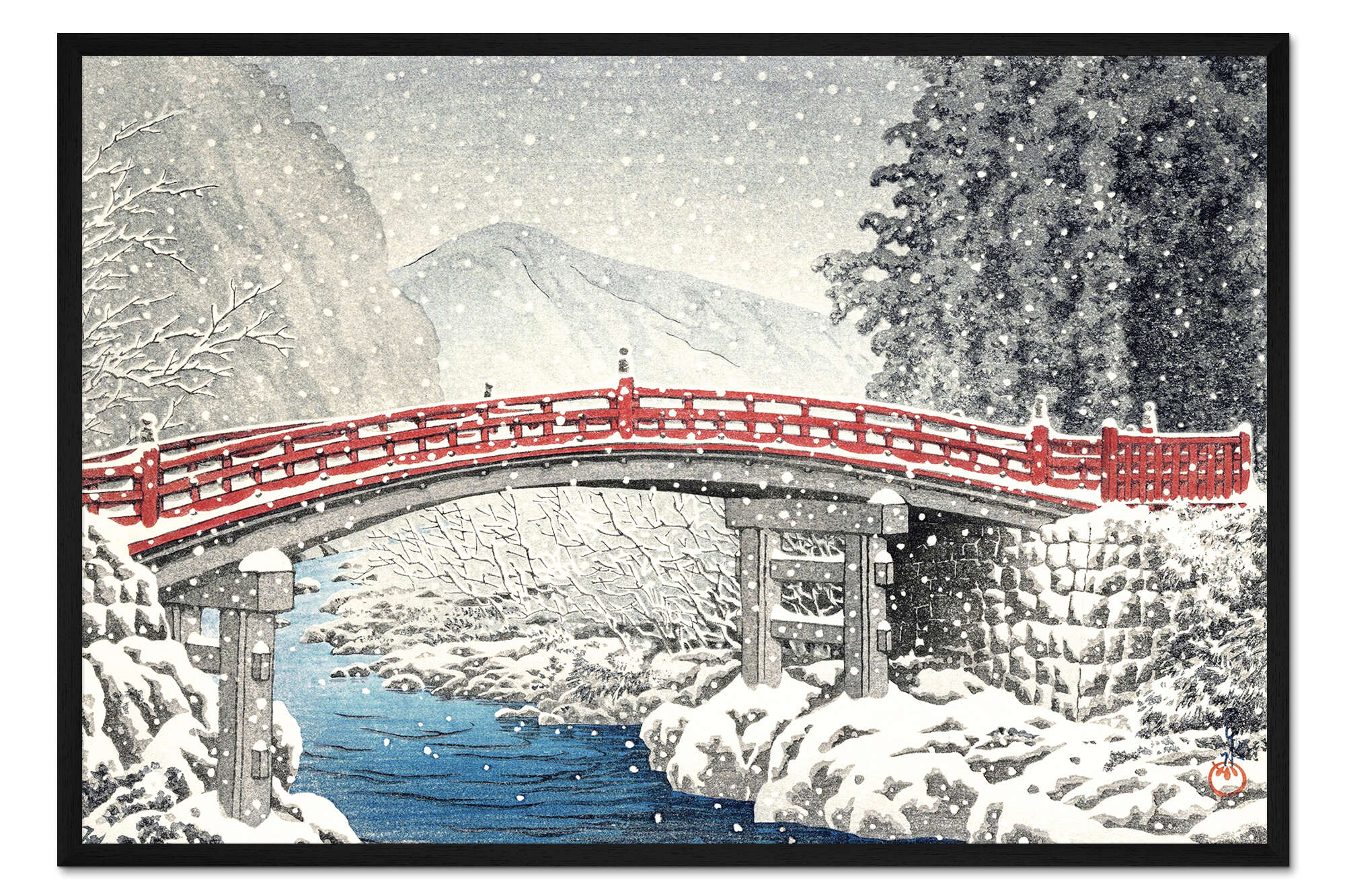 Posterlounge   Wandbilder   Malerei   Asiatische Kunst   Kawase Hasui   Gerahmter Kunstdruck Shinkyo-Brücke in Nikko unter dem Schnee