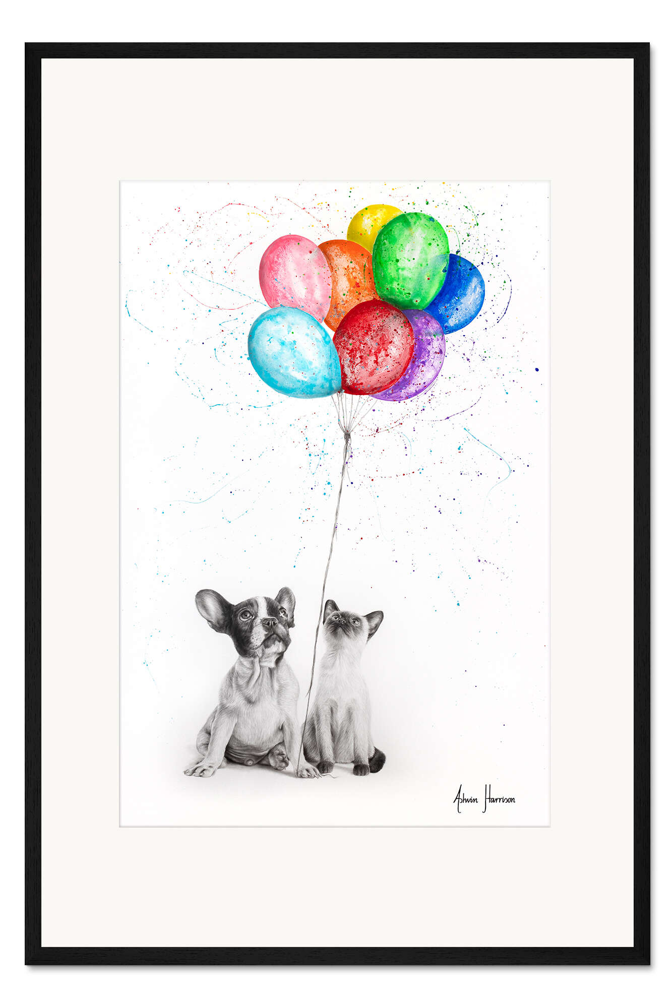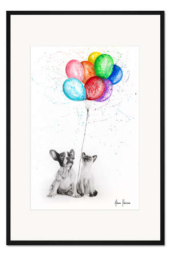 Posterlounge   Wandbilder   Illustration   Zeichnung & Skizze   Ashvin Harrison   Gerahmter Kunstdruck Frenchie und Siamese mit bunten Ballons