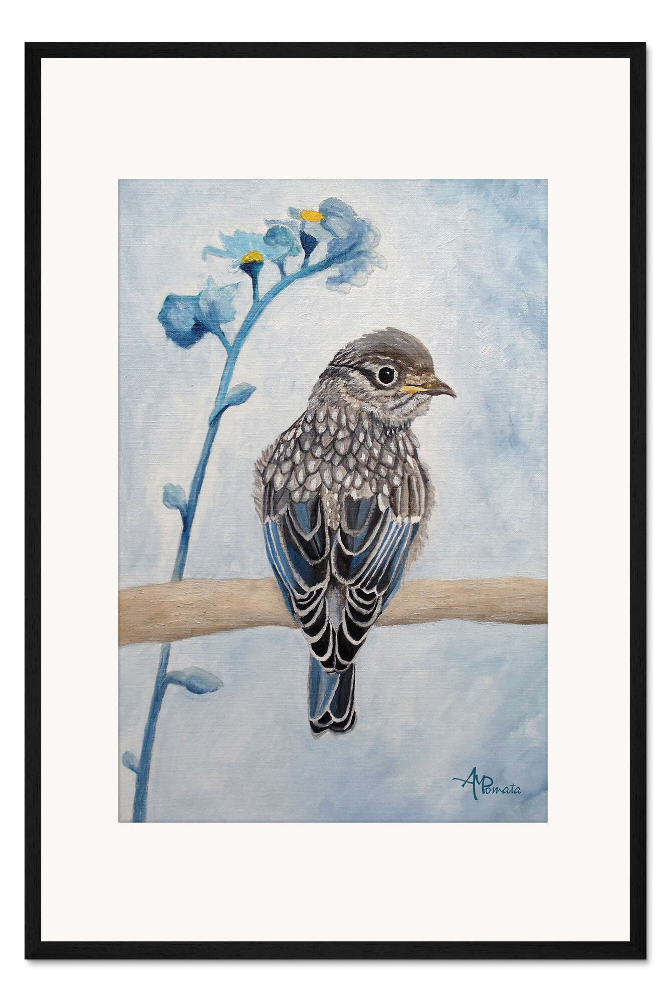 Posterlounge   Wandbilder   Tiere   Vögel   Ángeles M. Pomata   Gerahmter Kunstdruck Drossel mit blauer Blume