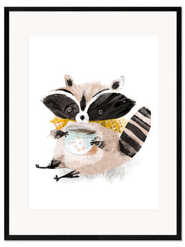 Gerahmter Kunstdruck Waschbär mit Kaffee