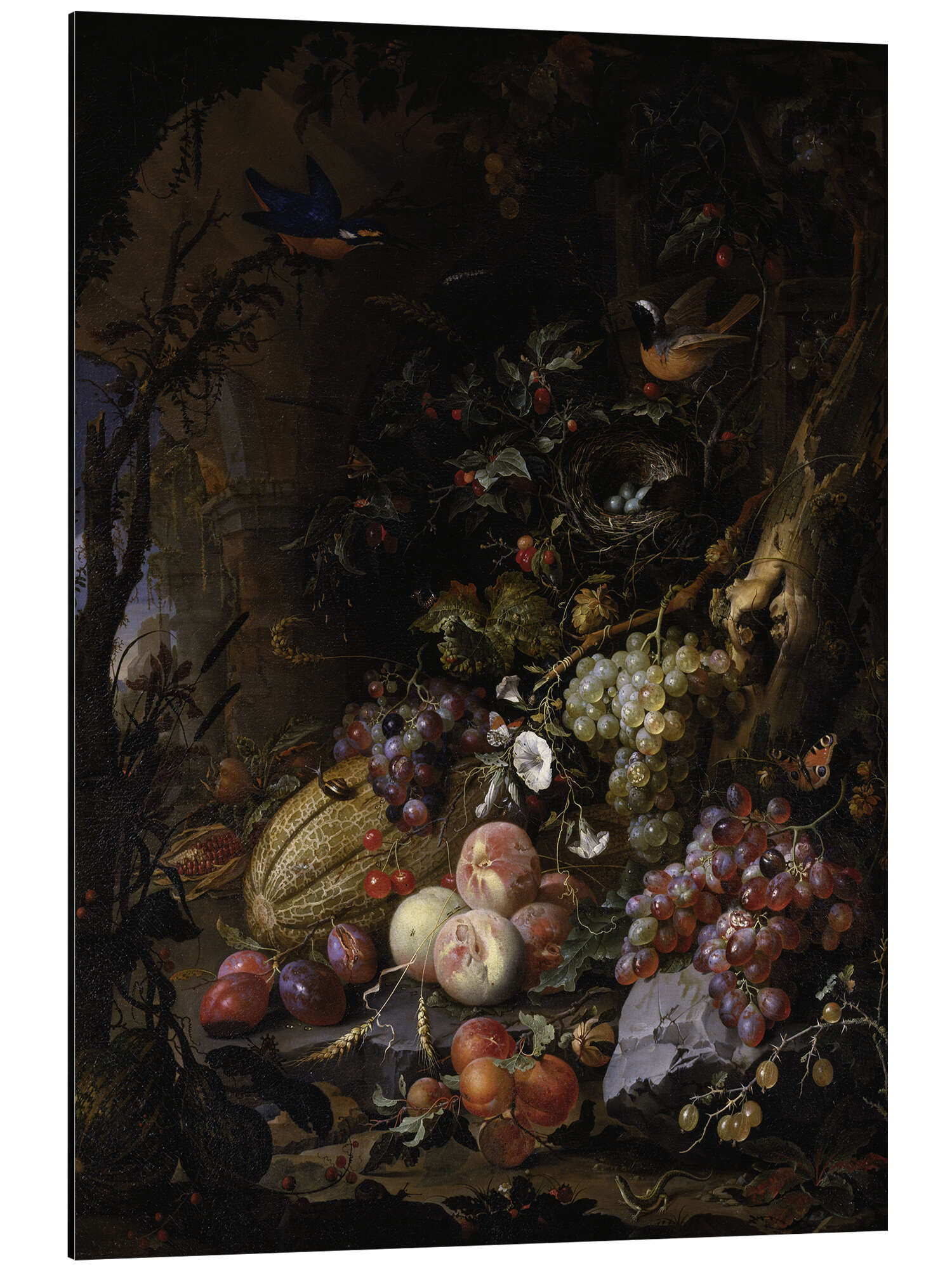 Posterlounge   Wandbilder   Essen & Trinken   Obst   Abraham Mignon   Magnettafel Blumen, Früchte, Vögel und Insekten in einer Landschaft mit Ruinen