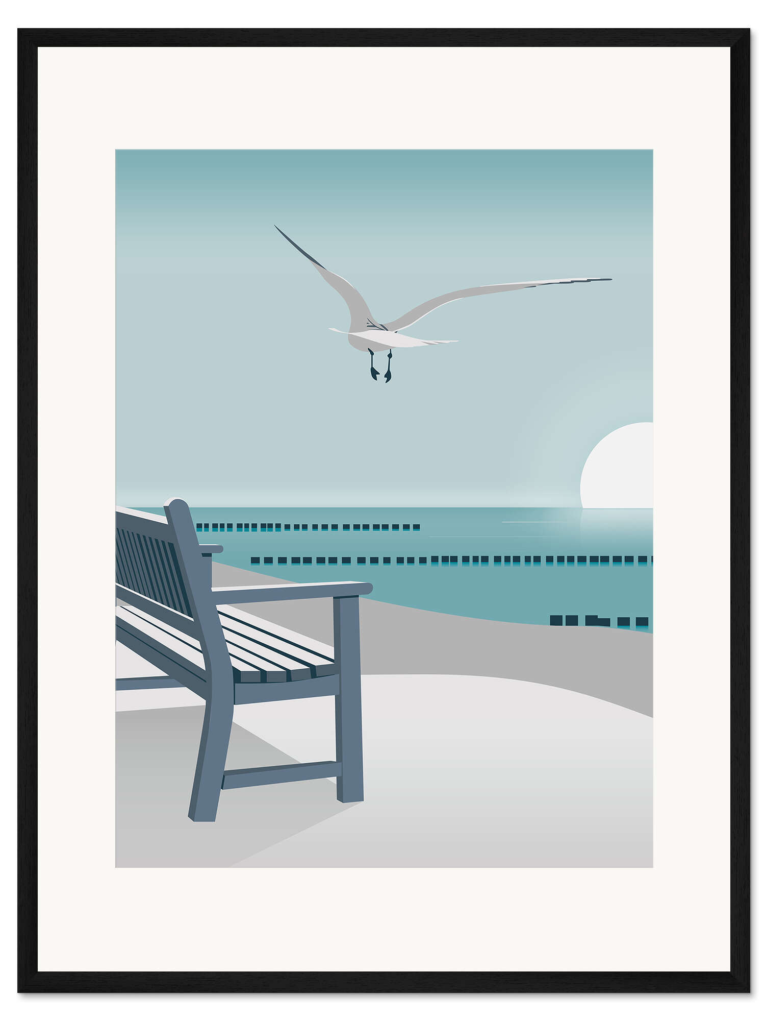 Posterlounge   Wandbilder   Illustration   Elke Frisch   Gerahmter Kunstdruck Bank am Meer