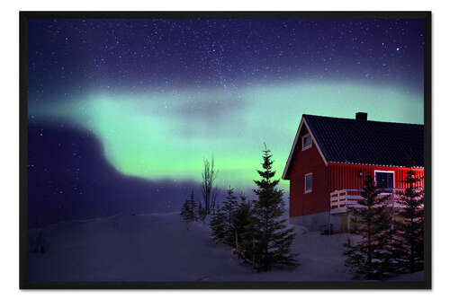 Posterlounge   Wandbilder   Fotografie   Robert Seitz   Gerahmter Kunstdruck Rotes Norweger-Haus mit Polarlicht im Winter