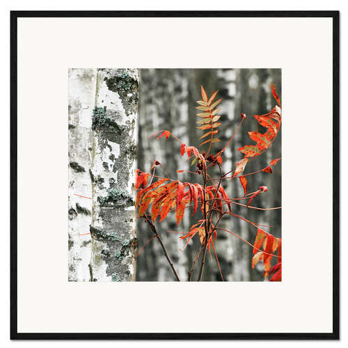 Gerahmter Kunstdruck Rote Herbstblätter vor der weißen Birken