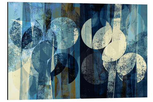 Modernes Wohnzimmer mit abstrakten, blauen Wandbildern über dem Sideboard