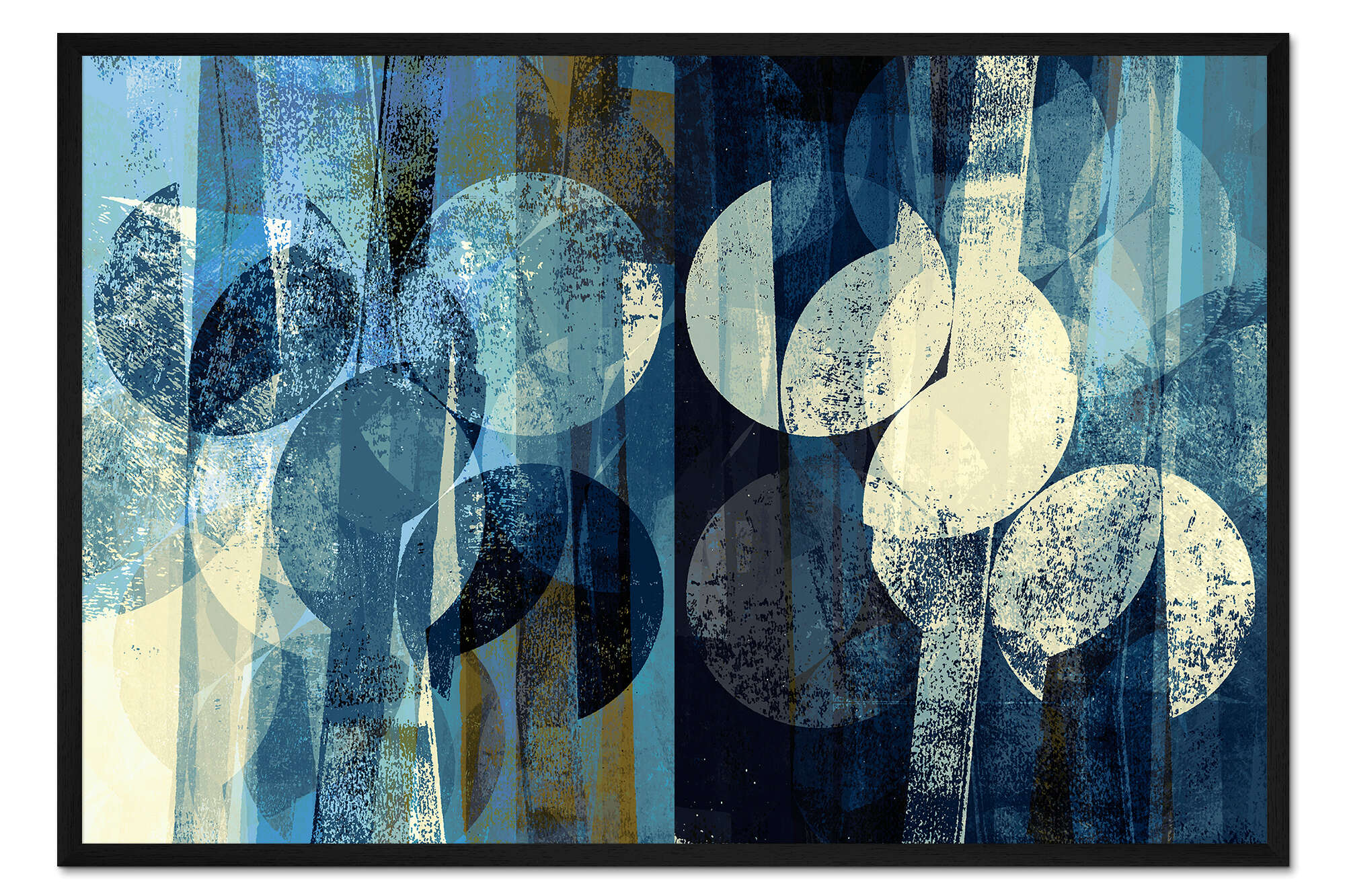 Modernes Wohnzimmer mit abstrakten, blauen Wandbildern über dem Sideboard