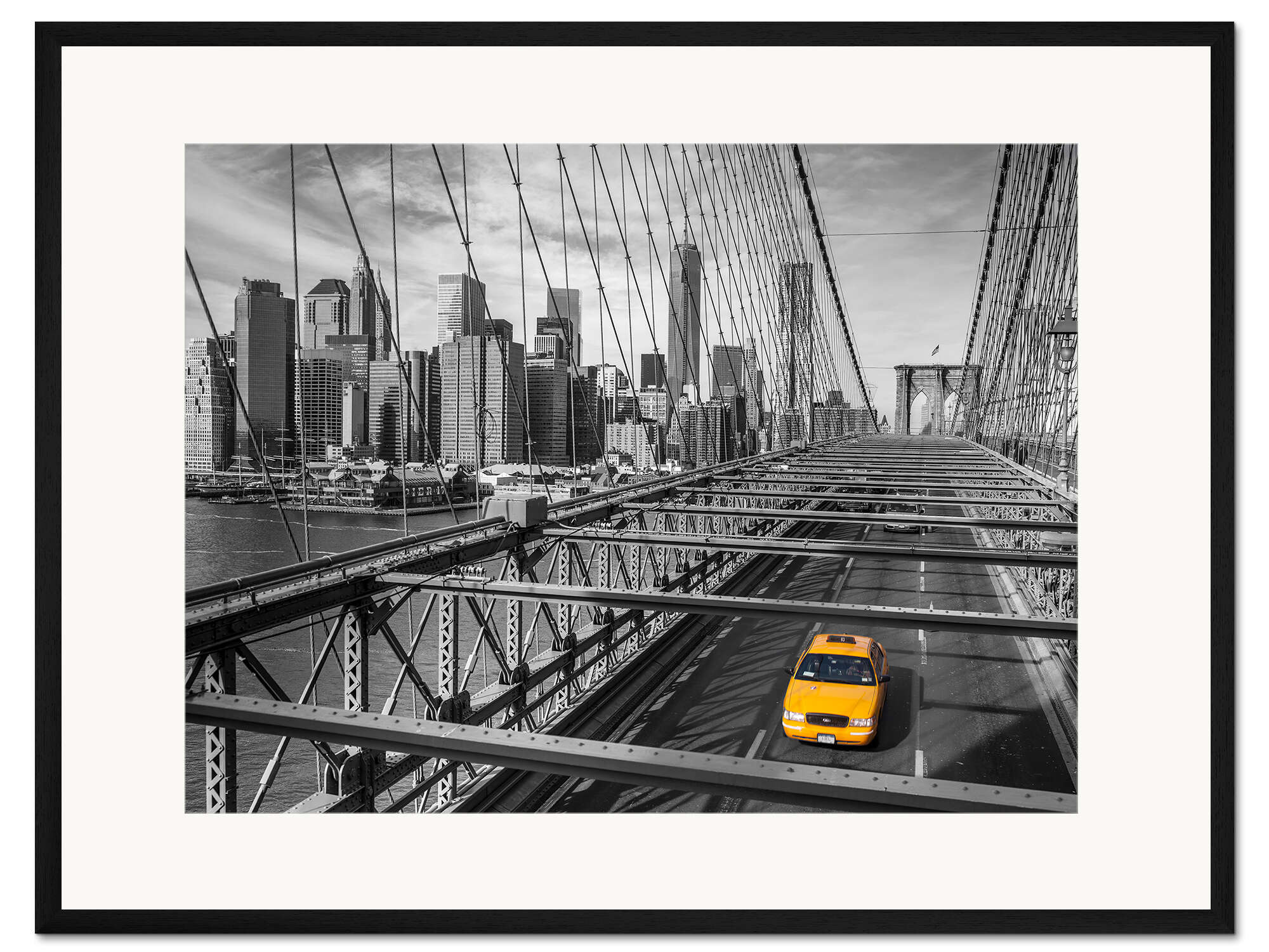 Posterlounge   Wandbilder   Schwarz-Weiß   Assaf Frank   Gerahmter Kunstdruck Ein gelbes Taxi auf der Brooklyn Bridge