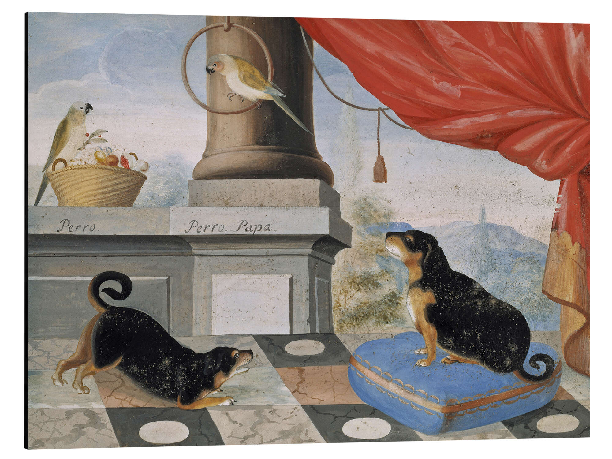 Magnettafel Zwei Hunde und zwei Papageien auf einer Terrasse