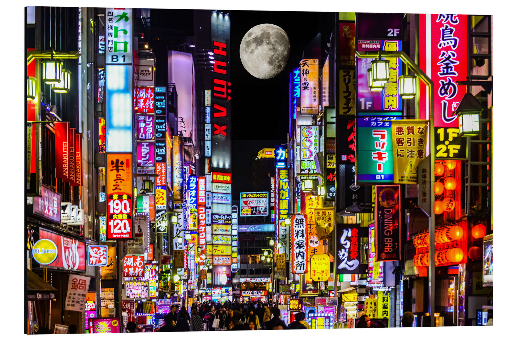 Posterlounge   Wandbilder   Fotografie   HADYPHOTO   Magnettafel Neonwerbung auf der Kabukicho Straße und Vollmond, Tokio