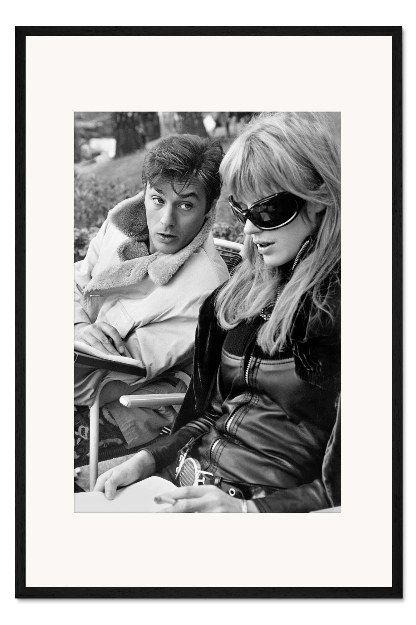 Posterlounge   Wandbilder   Schwarz-Weiß   Gerahmter Kunstdruck Alain Delon und Marianne Faithfull am Set von 'Nackt unter Leder', 1967