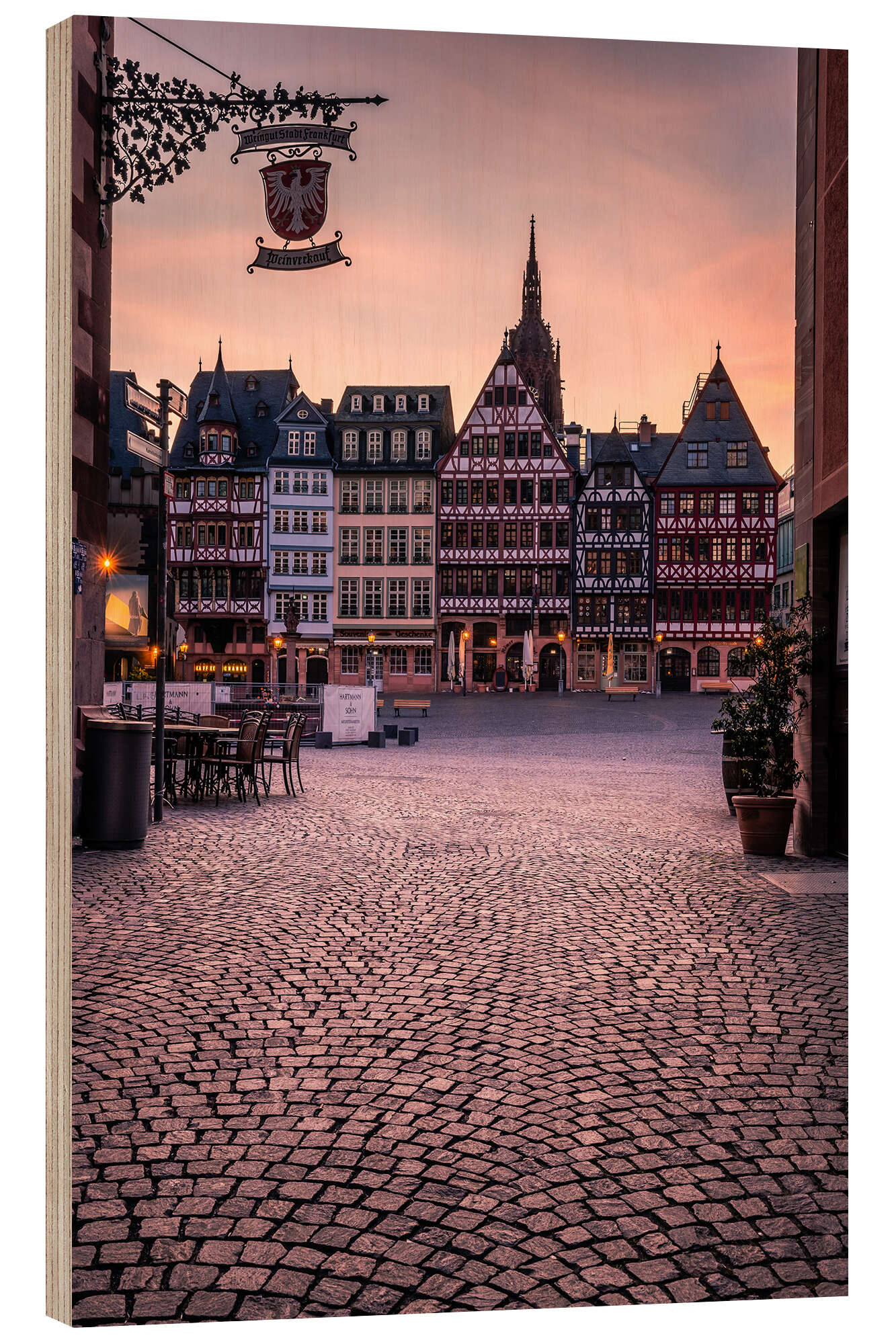Holzbild Frankfurt am Main, Fachwerkhäuser im Sonnenaufgang