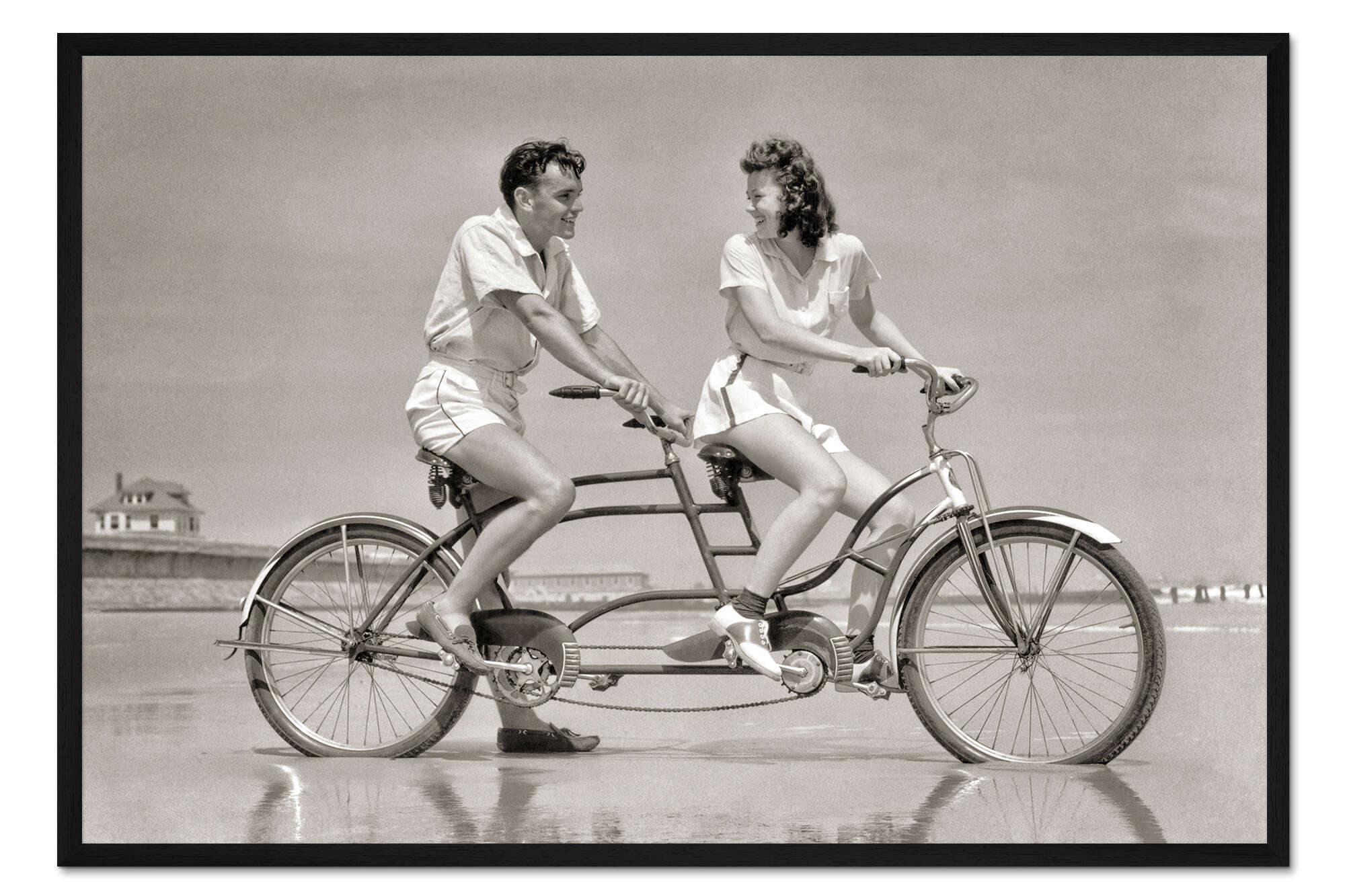 Posterlounge   Wandbilder   Schwarz-Weiß   Gerahmter Kunstdruck Pärchen fährt Tandem am Strand, 1940er