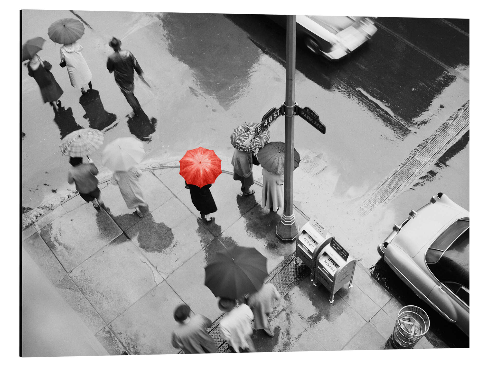 Magnettafel Straßenszene mit rotem Regenschirm, 1950er, New York City