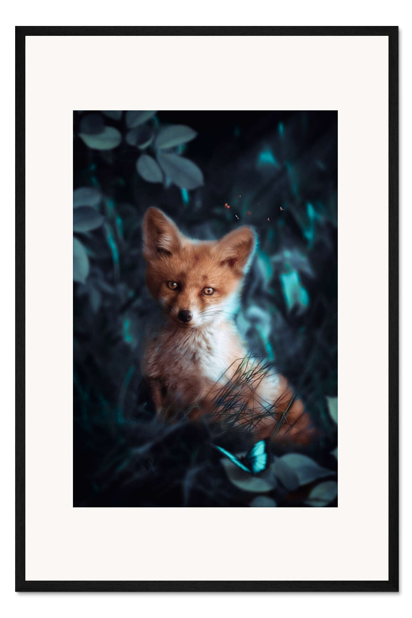 Posterlounge   Wandbilder   Fotografie   Fotocollage   Gen Z   Gerahmter Kunstdruck Babyfuchs und Schmetterling im Wald