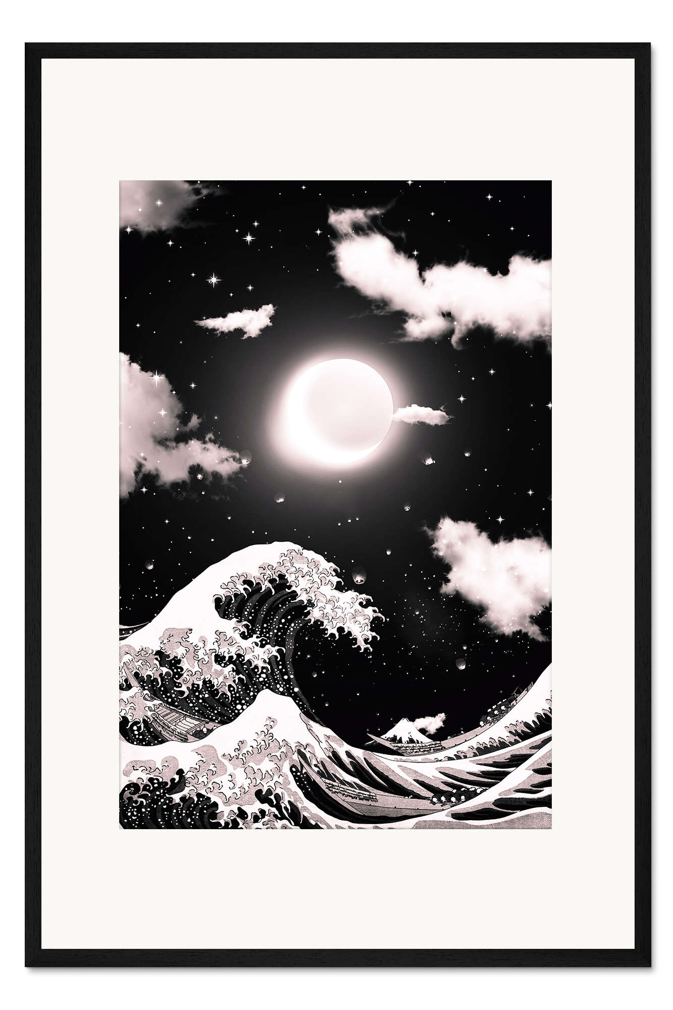 Posterlounge   Wandbilder   Fantasy   Gen Z   Gerahmter Kunstdruck Große Welle von Kanagawa und schwarz-weiße Mondfinsternis