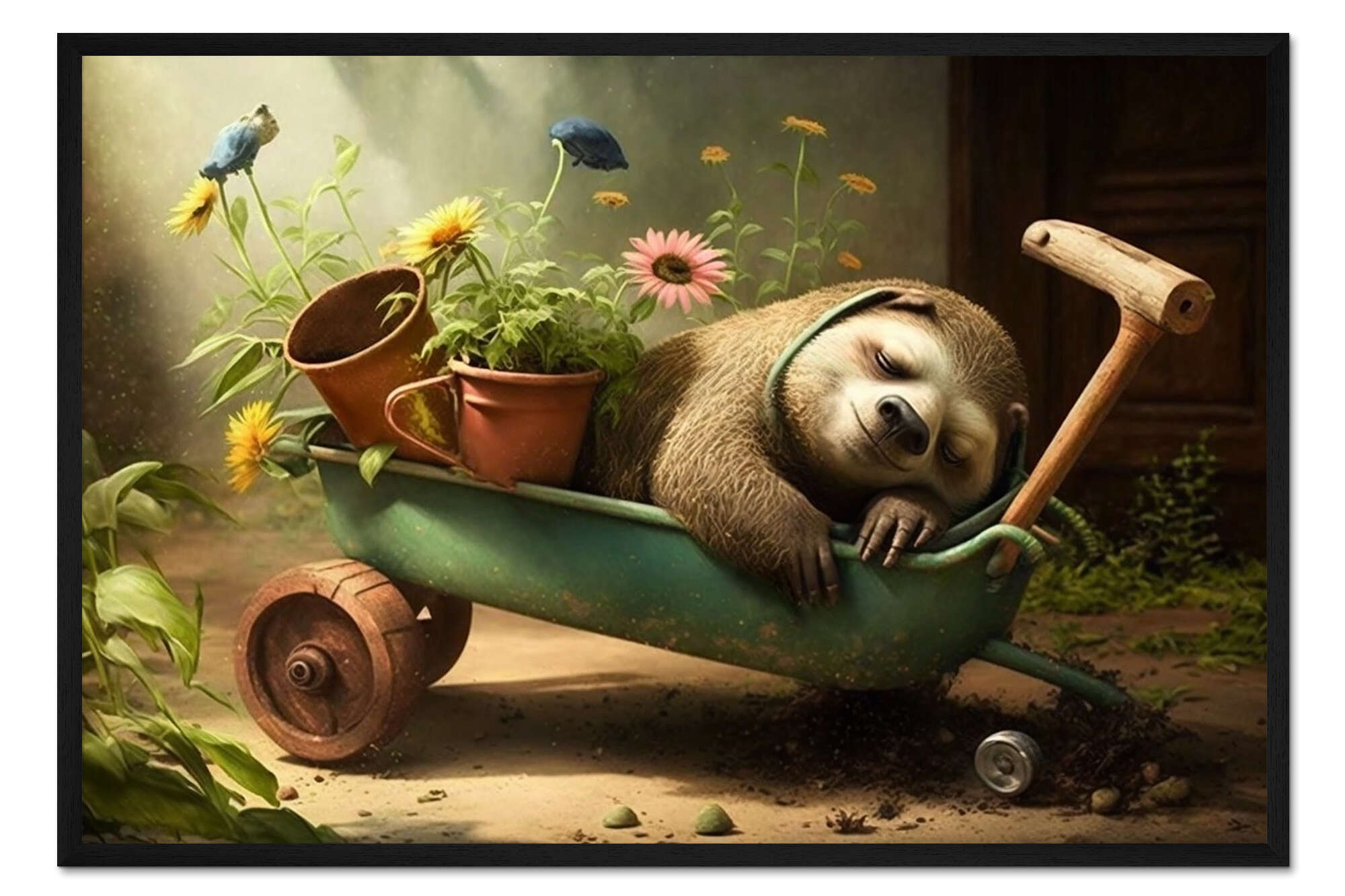 Posterlounge   Wandbilder   Illustration   Michael artefacti   Gerahmter Kunstdruck Faultier bei der Gartenarbeit