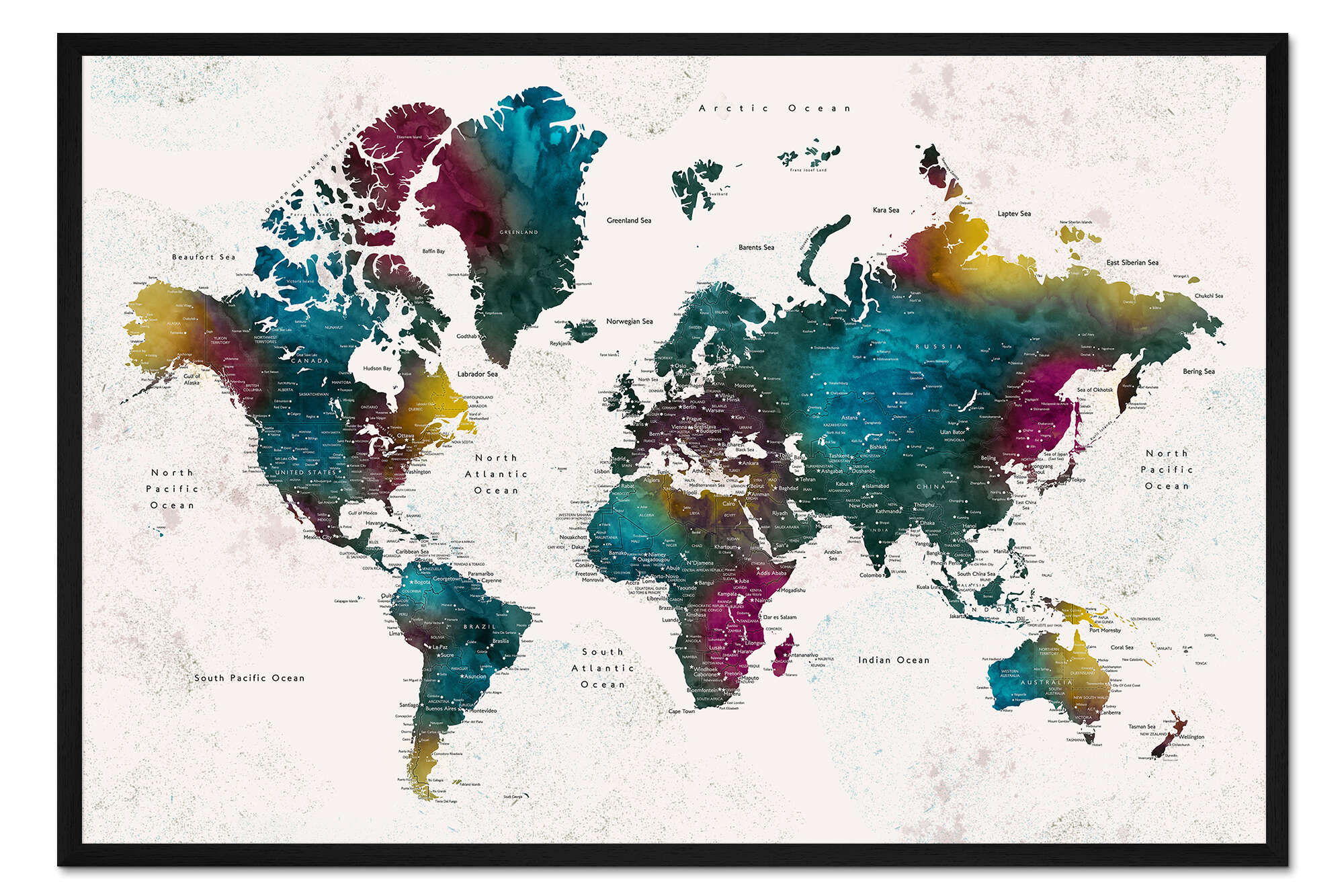 Posterlounge   Wandbilder   Illustration   Rosana Laiz Blursbyai   Gerahmter Kunstdruck Weltkarte mit Städten (englisch)