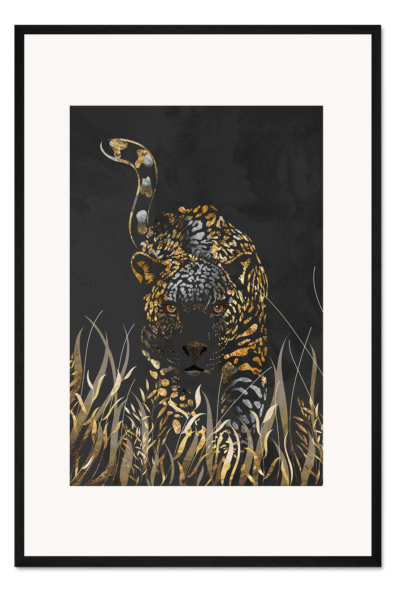 Posterlounge   Wandbilder   Illustration   Sarah Manovski   Gerahmter Kunstdruck Goldjaguar im schwarzen Gras