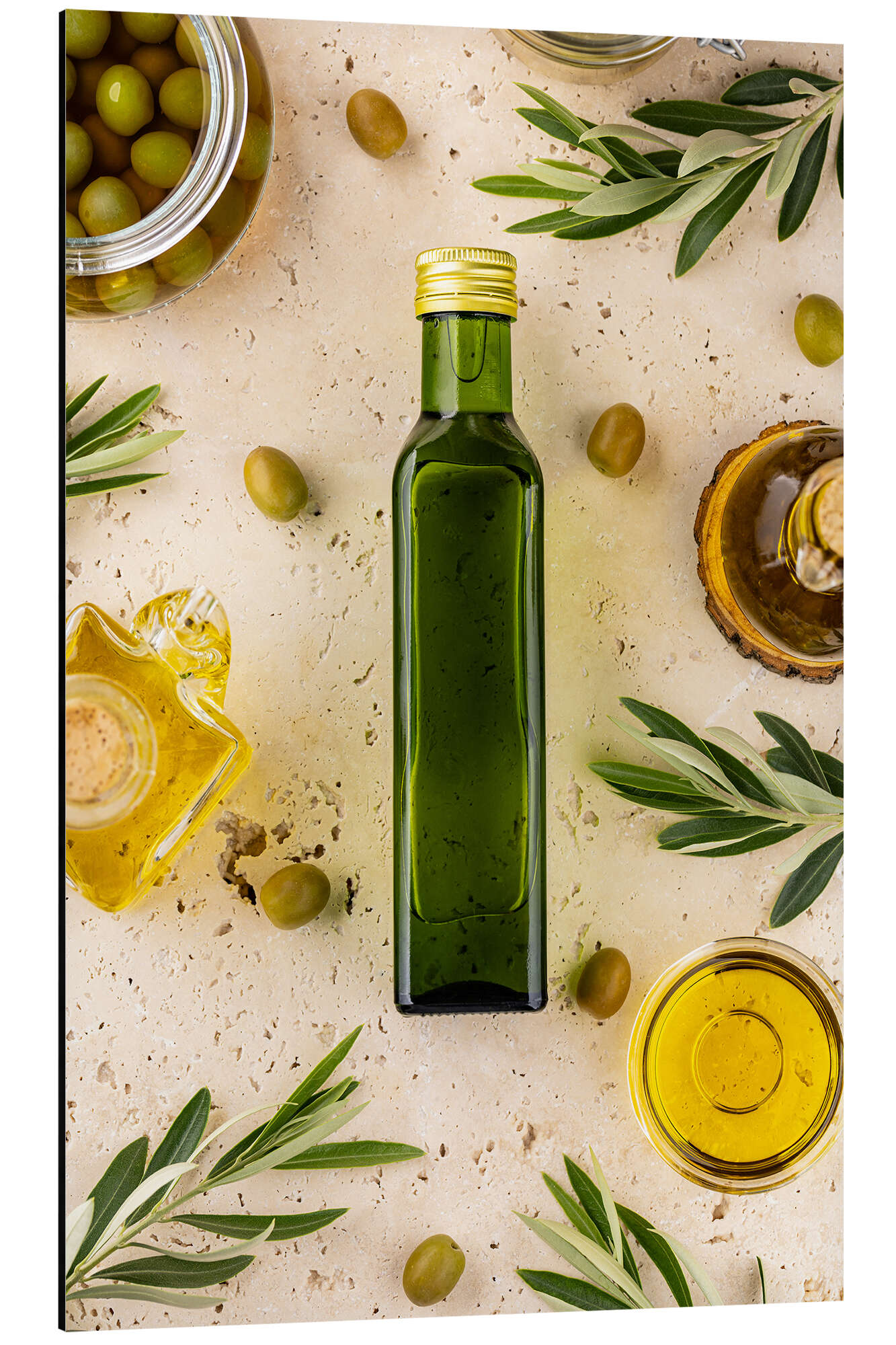 Glasflasche mit Olivenöl, Blättern und Oliven