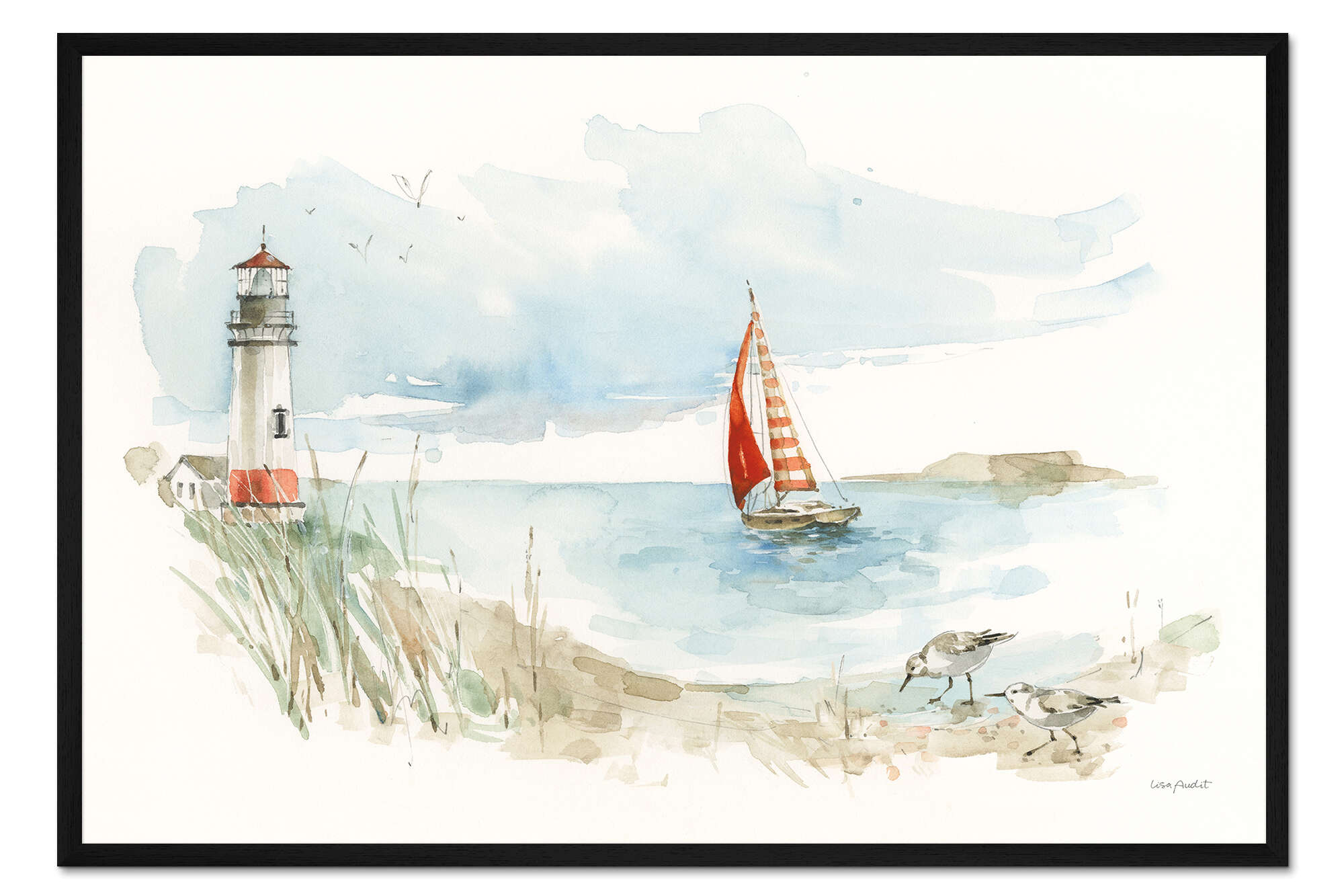 Posterlounge   Wandbilder   Malerei   Aquarell Malerei   Lisa Audit   Gerahmter Kunstdruck Segelboot und Leuchtturm