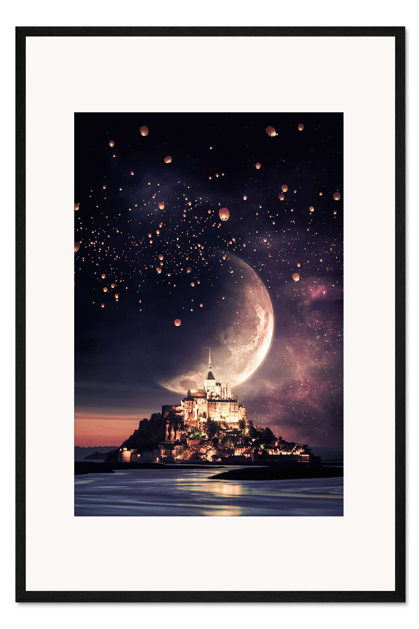 Posterlounge   Wandbilder   Fotografie   Fotocollage   Gen Z   Gerahmter Kunstdruck Mont Saint Michel, Mond und chinesische Laternen