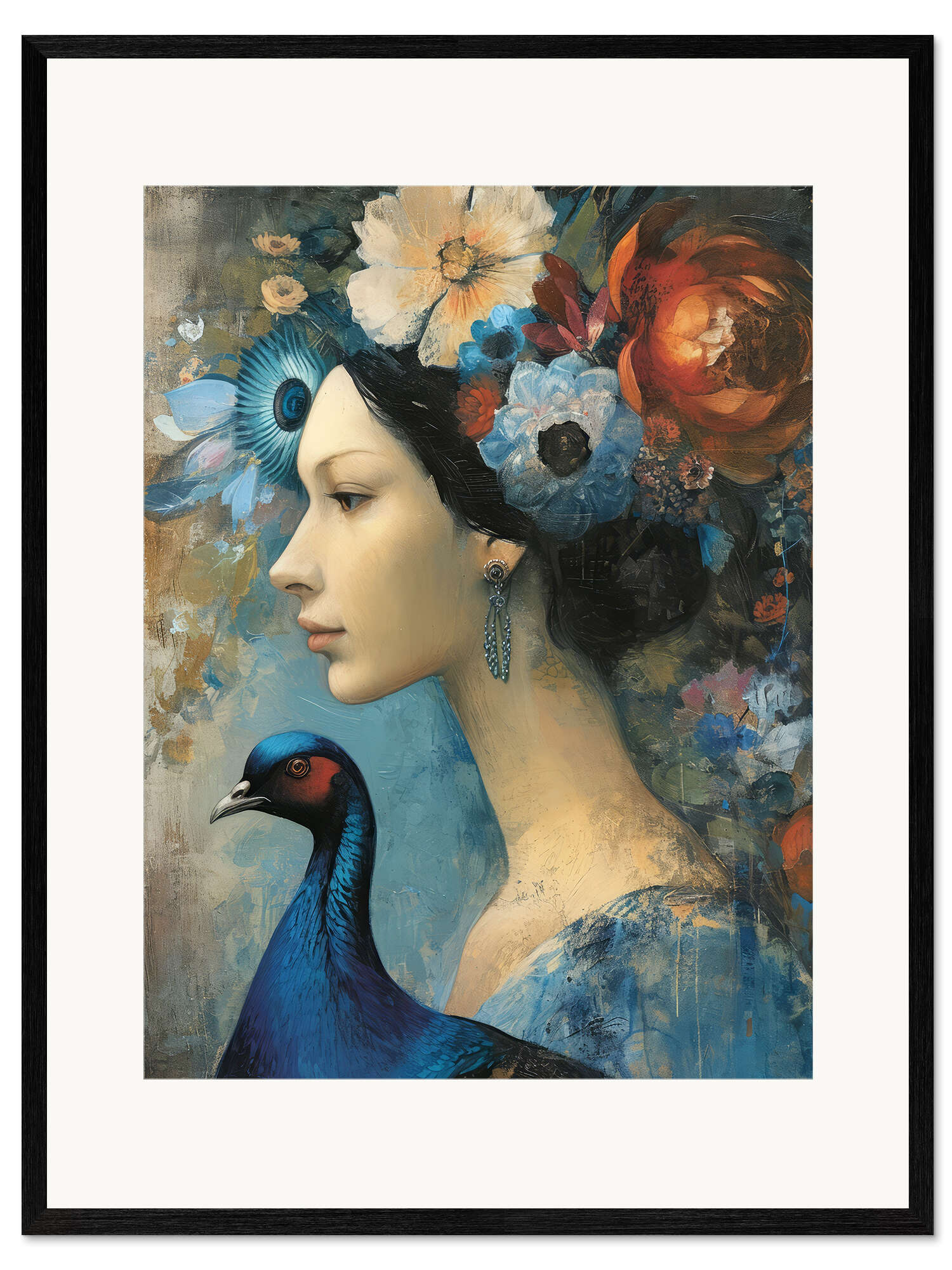Gerahmter Kunstdruck Dame mit Pfau