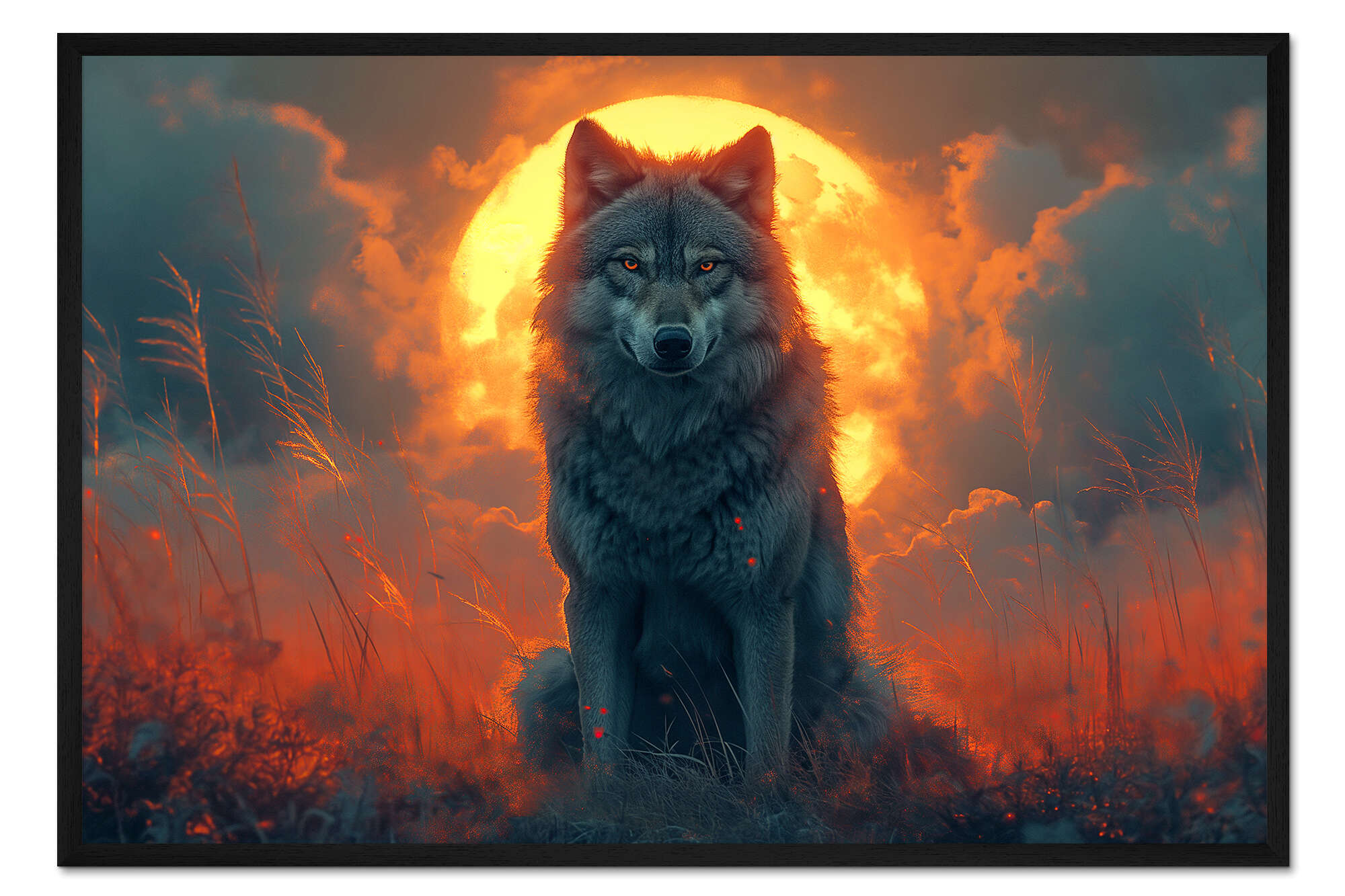 Posterlounge   Wandbilder   Fotografie   Fotocollage   Michael artefacti   Gerahmter Kunstdruck Ein grauer Wolf im Schein des Sonnenuntergangs