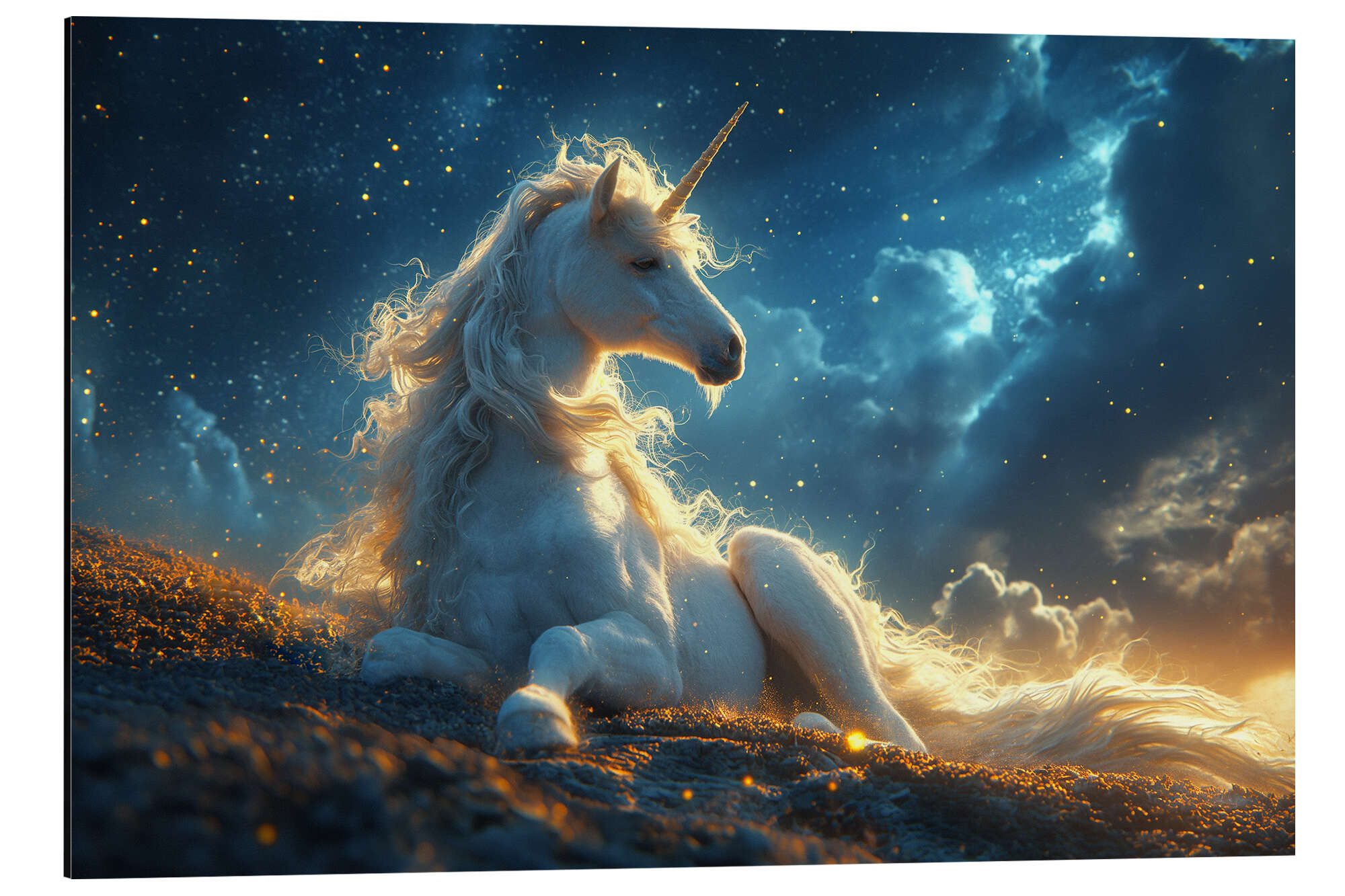 Posterlounge   Wandbilder   Fantasy   Einhörner   Michael artefacti   Magnettafel Majestätisches Einhorn ruht am Abend auf einer Wiese