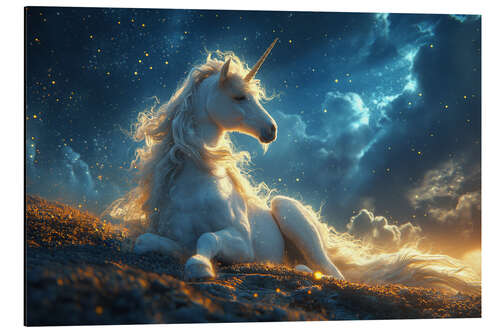 Majestätisches Einhorn ruht am Abend auf einer Wiese von Michael artefacti
